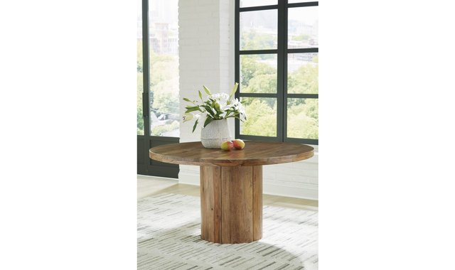 Discover something extraordinary with this clean-lined dining table. The rich natural beauty of the solid wood round pedestal and sturdy top brings an organically stunning vibe to your home. Strikingly simple, this piece creates an understated, modern feast for the eyes whether it’s used for dining or when friends drop by to hang.