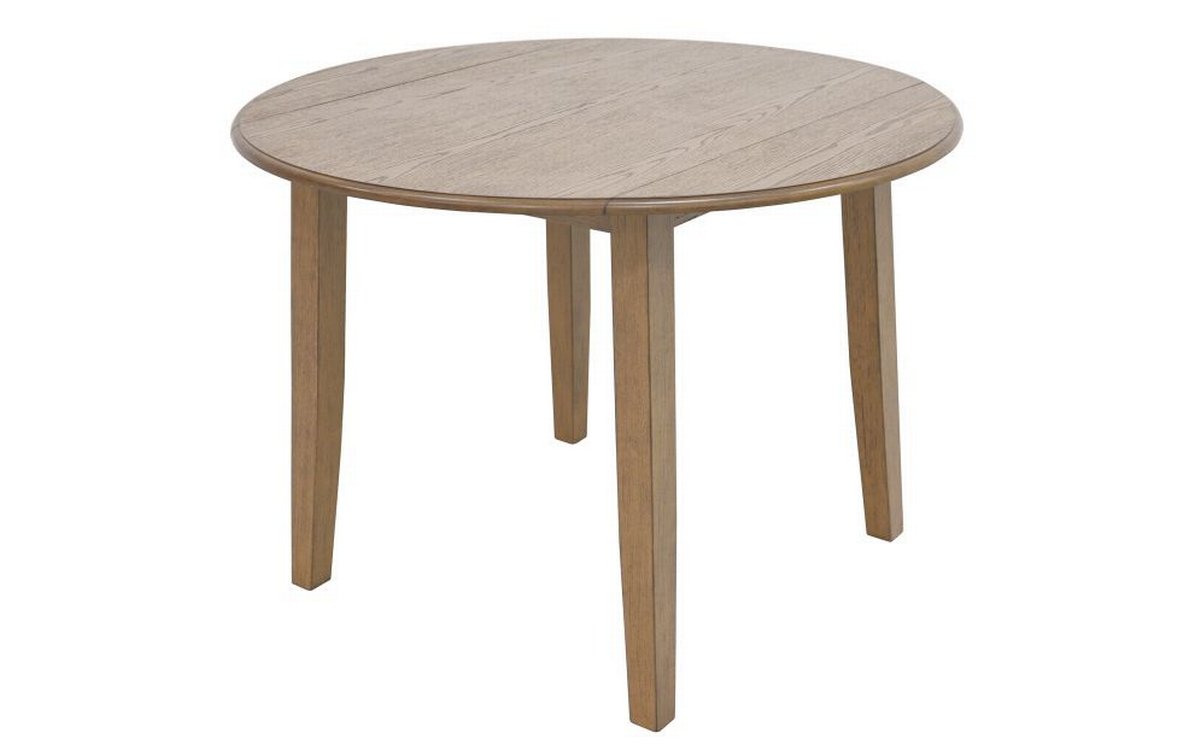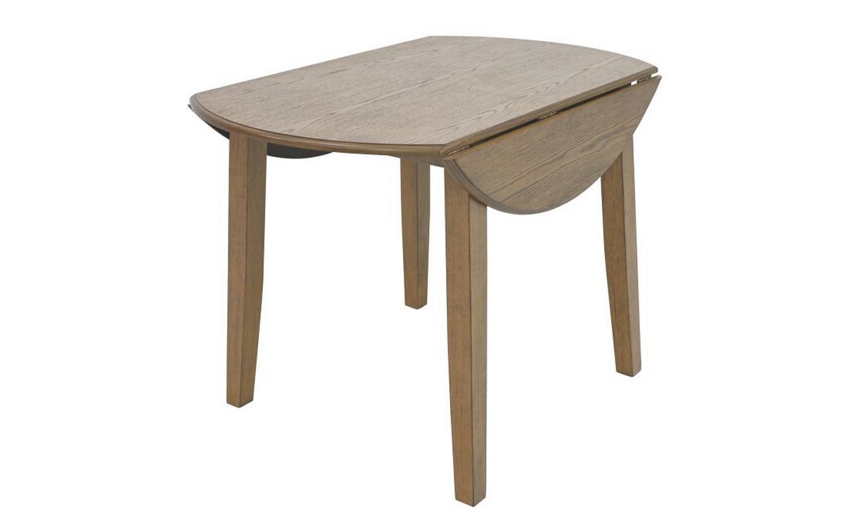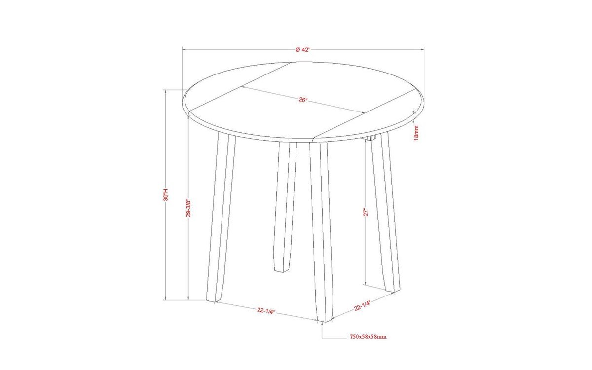 Modern 42" round dining table Drop-leaf design is perfect for smaller spaces, each leaf is 8" Engineered wood table top has walnut finish with visible wood grain Solid rubberwood legs with walnut finish Comfortably fit four dining chairs Dimensions: Extended - 42" Dia. x 30"H; Folded - 42 x 26 x 30"H