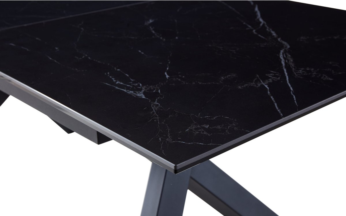 The Amos table's ceramic and tempered glass top opens in the center to reveal a discreet, integrated extension leaf. The base of this model consists of square steel legs that meet beneath the table and flare out towards the floor, creating ever-changing perspectives.