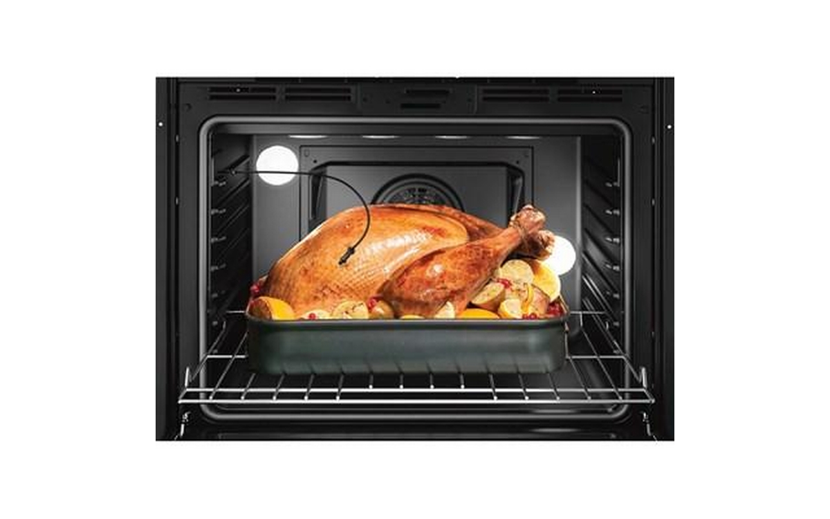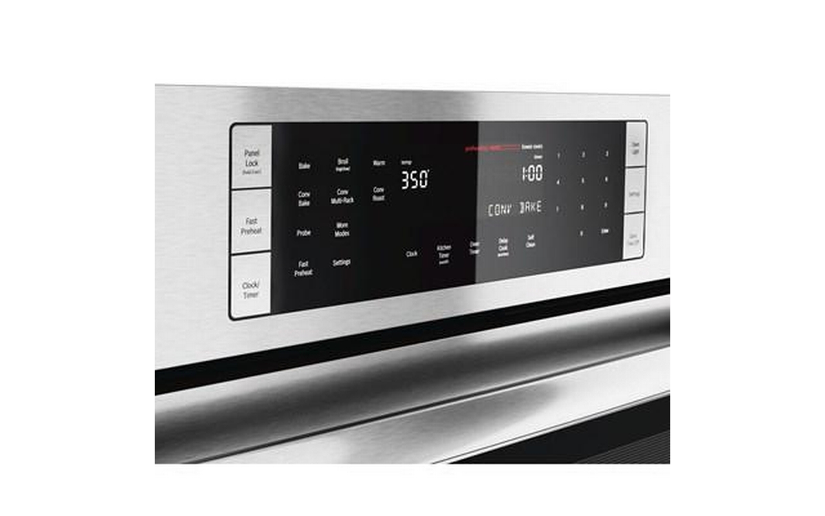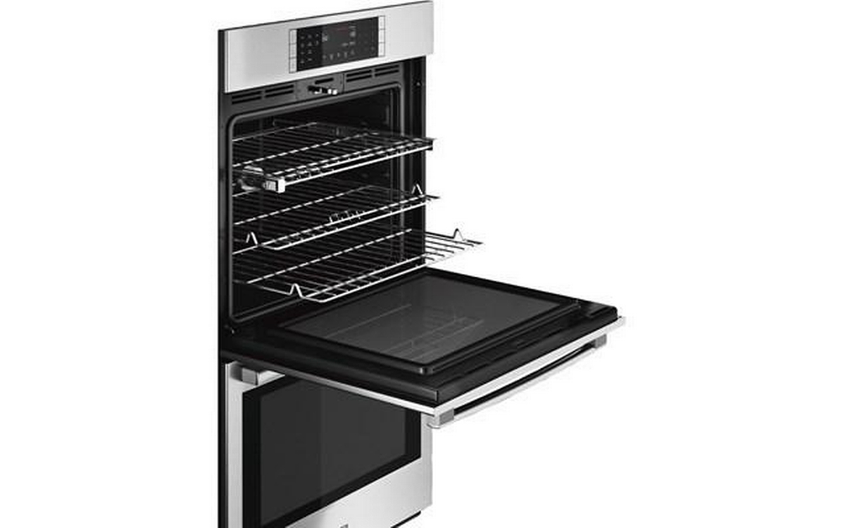 This Bosch 800 Series double wall oven features touch control with SteelTouch™ buttons, full-extension telescopic racks and QuietClose™ door shut.