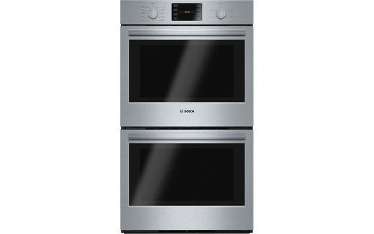Bosch 30" 500 Series electric built-in double wall oven with large oven capacity of 4.6 cu.ft. for each oven. This Bosch wall oven features Genuine European convection, heavy-duty metal knobs and 10 specialized cooking modes in upper cavity.