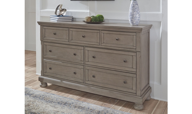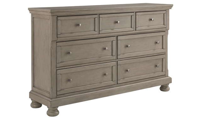 Satisfying your taste for tradition, this dresser sports serene sophistication. Forever classic design details—inlaid panels, silvertone patina hardware and bun feet—are so easy to love. Burnished light gray finish elevates the look with modern sensibility. Seven roomy drawers keep your wardrobe organized in style.