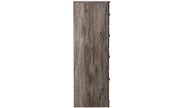 With its clean-lined look and modern attitude, this chest of drawers is a fresh style awakening. Warm gray hue over replicated oak grain easily complements other furniture finishes. Smooth drawer fronts with antiqued pewter-tone handles completes the aesthetic.