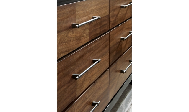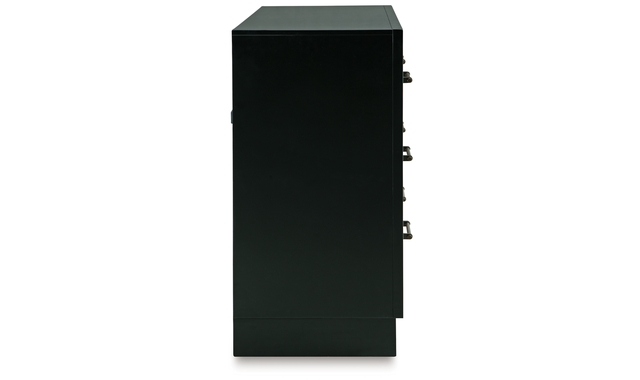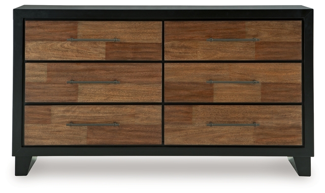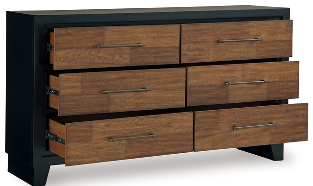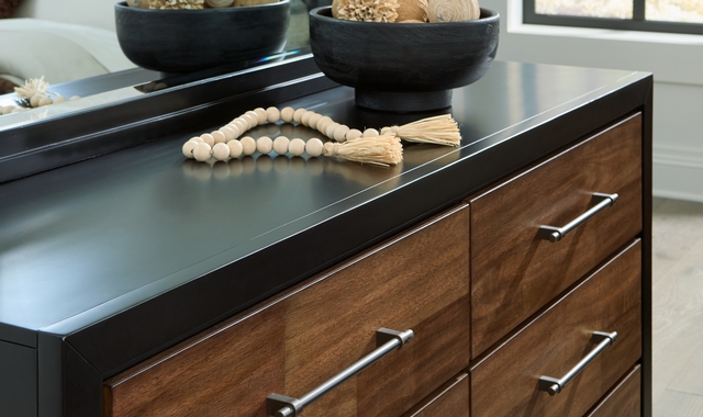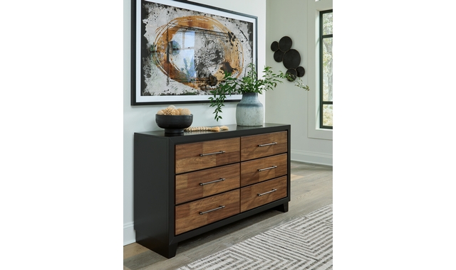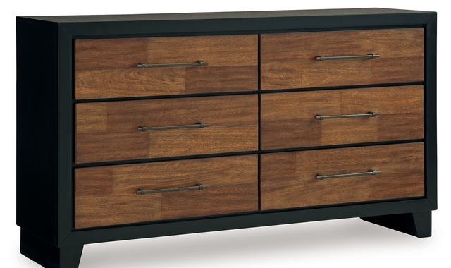 Experience the captivating allure of this dresser, an effortless blend of casual and refined aesthetics. Its two-tone finish combines satin black with a rich brown wood tone for a modern, relaxed vibe that you'll love waking up to. Perfectly suited for your contemporary home, this dresser has plenty of drawer space to tuck away your wardrobe and spare bed linens.