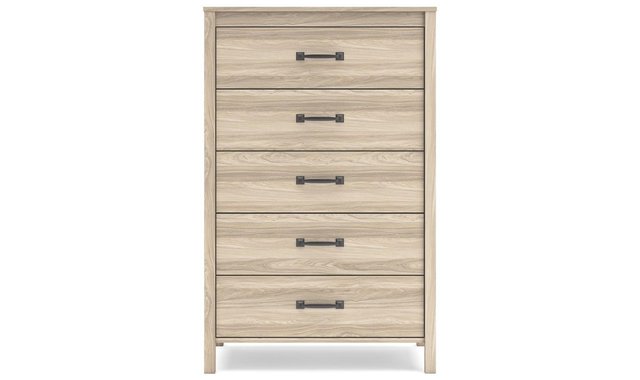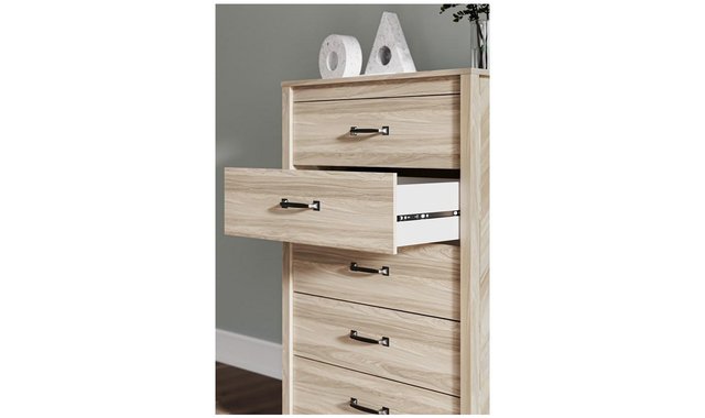 | Additional Information | • Made with engineered wood (MDF/particleboard/plywood) and decorative laminate for the right balance of affordability and durability • Two-tone finish (dry, light finish over replicated oak grain; light chevron pattern) • Decorative laminate replicates natural or man-made material surfaces with consistent color, pattern and texture • Dark-colored hardware • 5 smooth-gliding drawers with ball-bearing side glides; vinyl-wrapped sides and back for durability • Safety is a top priority, clothing storage units are designed to meet the most current standard for stability, ASTM F 2057 (ASTM International) • Drawers extend out to accommodate maximum access to drawer interior while maintaining safety |