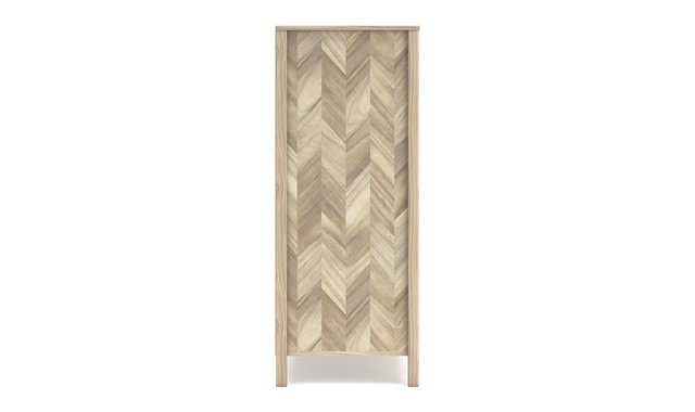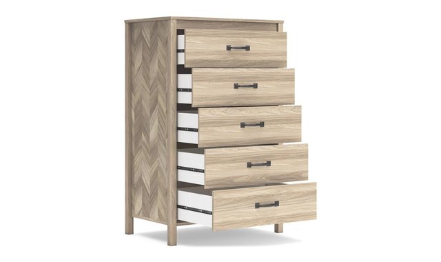 Transform your bedroom into an instant sanctuary. Pairing the look of oak grain with a unique chevron pattern, this chest of drawers introduces a touch of mid-century modern style that's sure to elevate your space. Catering to your busy lifestyle, this chest is ready to assemble in the comfort of your home.