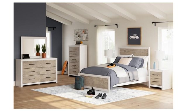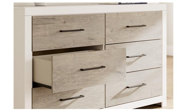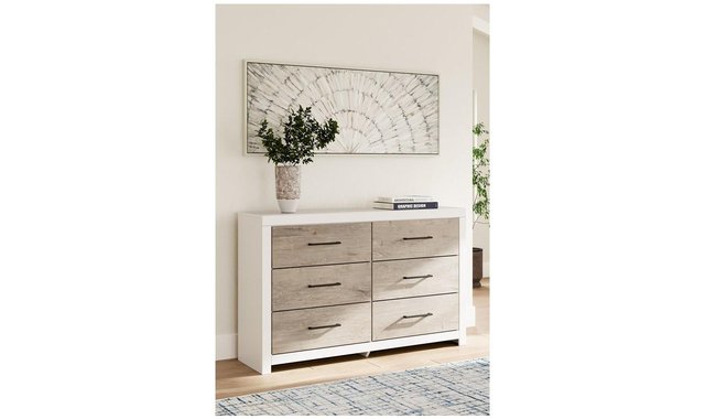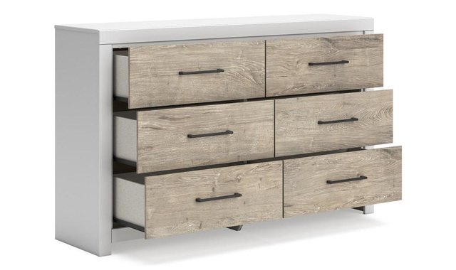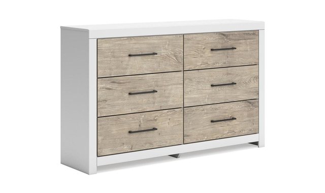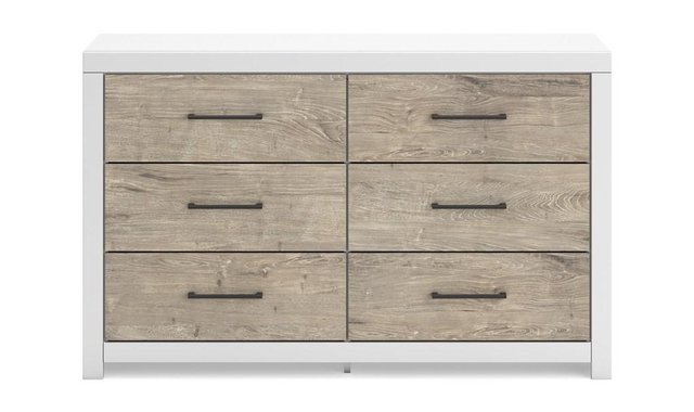 Relaxed yet striking, this dresser brings casual beauty and function to your dream destination. You're sure to love its six spacious drawers that easily glide open and offer plenty of storage for your wardrobe and spare bed linens. A delightful two-tone treatment blends a fresh replicated oak grain with a matte white finish, while sleek handles in an antiqued gunmetal finish lend a contemporary touch.