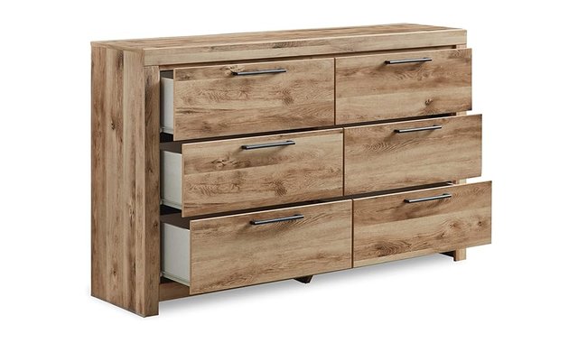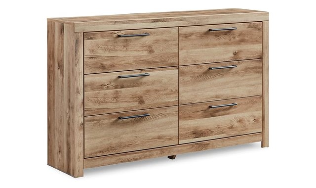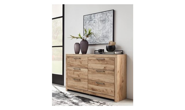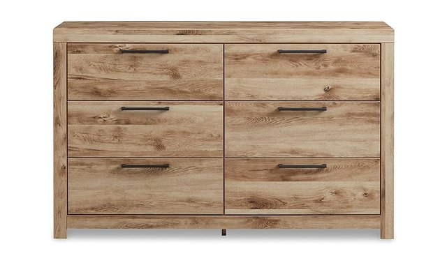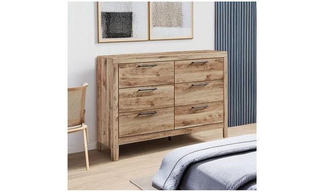 Inspired by natural beauty, refined to perfection. This dresser brings cozy outdoor vibes to your bedroom with its warm and inviting golden rustic finish. Handles in an antiqued gunmetal hue adorn the six drawers on its framed front, adding an industrial touch to the simple, streamlined design.