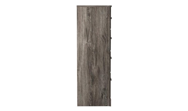 With its clean-lined look and modern attitude, this chest of drawers is a fresh style awakening. A warm gray hue over replicated oak grain easily complements other furniture finishes. Smooth drawer fronts with antiqued pewter-tone handles complete the aesthetic.