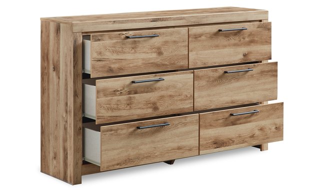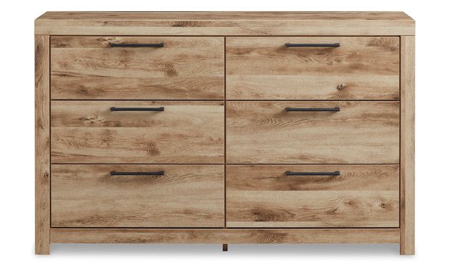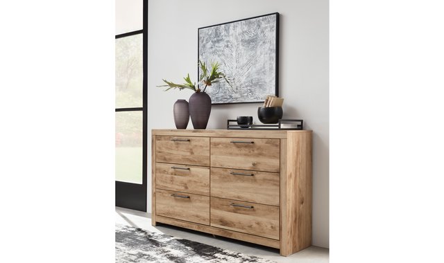 Inspired by natural beauty, refined to perfection. This dresser brings cozy outdoor vibes to your bedroom with its warm and inviting golden rustic finish. Handles in an antiqued gunmetal hue adorn the six drawers on its framed front, adding an industrial touch to the simple, streamlined design.
