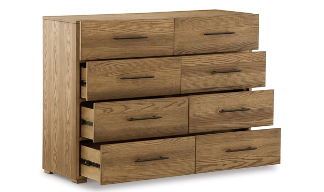 Taking an organic approach to the aesthetics of an organised bedroom, this warmly neutral 6-drawer double dresser has a natural appeal. An elegant bar pull in a blackened iron finish accentuates the drawer fronts, providing a subtle contrast to the sleek design. With its aura of casual sophistication, this piece elevates the everyday in your relaxing retreat.