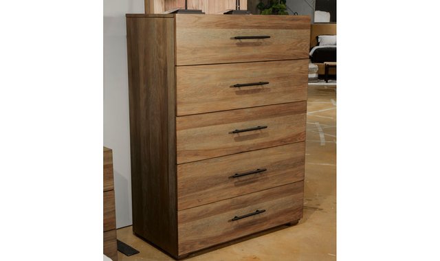 Taking an organic approach to the aesthetics of an organized bedroom, this warmly neutral 5-drawer dresser has a natural appeal. An elegant bar pulls in a blackened iron finish accentuating the fronts of the drawers, providing a subtle contrast to the sleek design. With its aura of relaxed refinement, this piece elevates the everyday in your relaxing retreat.