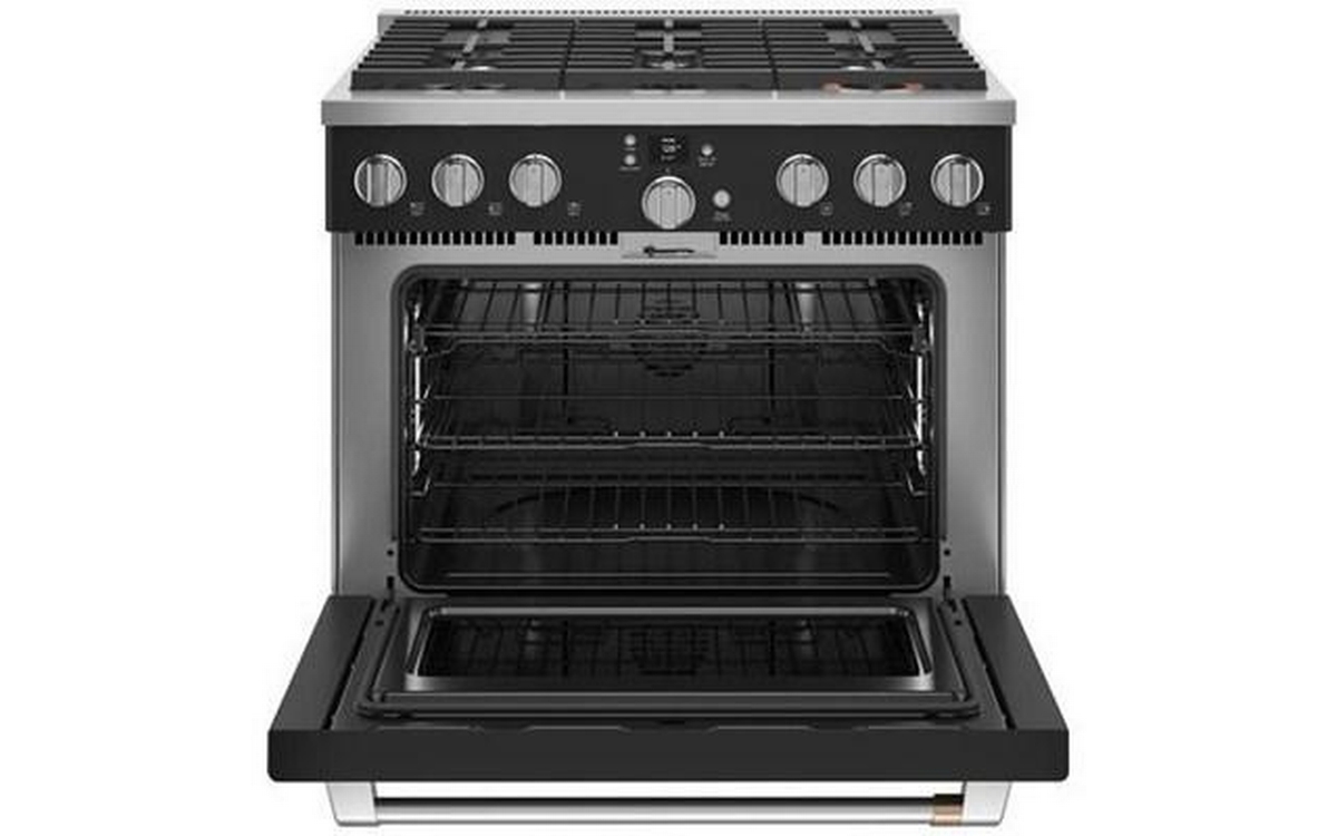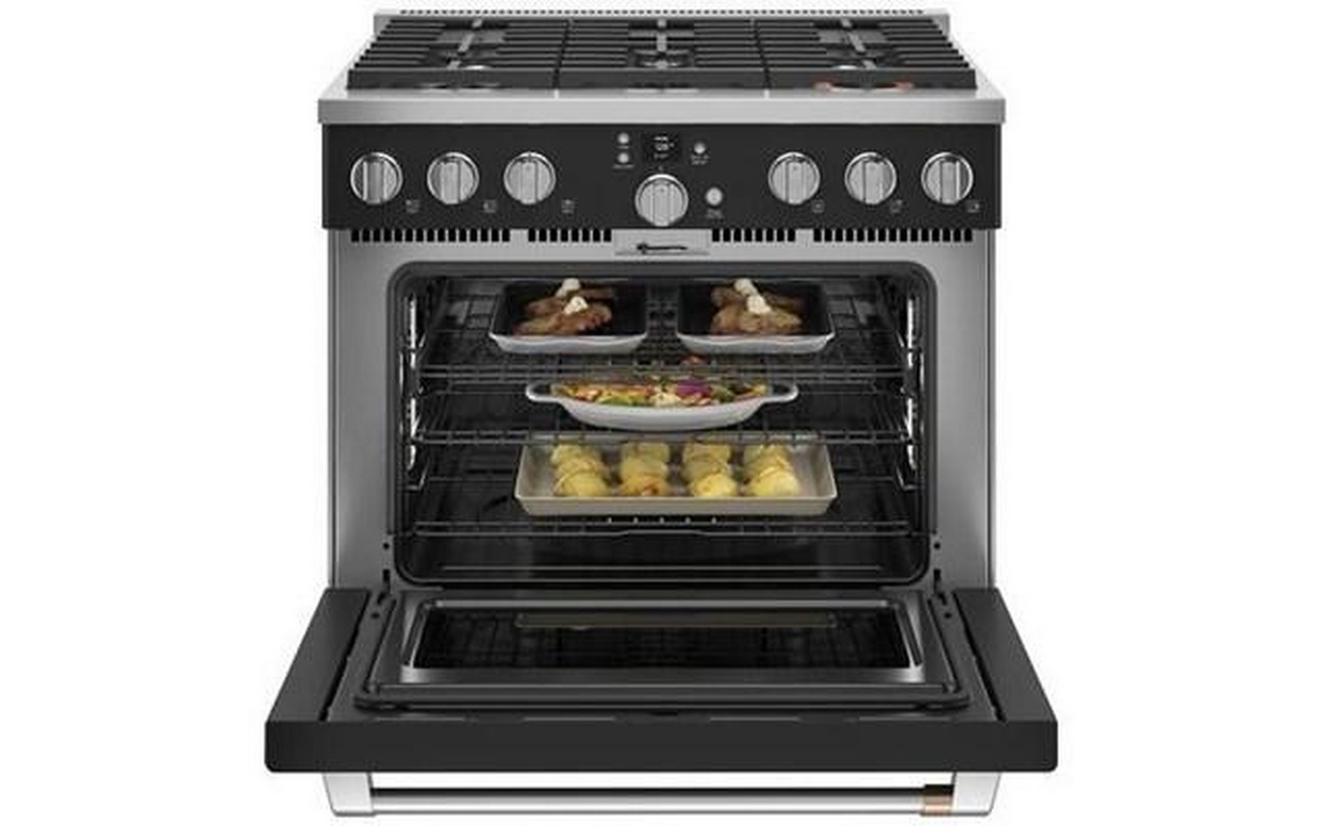 Café™ 36" smart dual-fuel commercial-style range with 6 burners (natural gas). This range offers a large capacity oven that fits a full-size catering pan, three racks, large 8-pass bake and broil elements for even heat coverage and Precision Oven modes to help guarantee results for meals of any size. The versatile cooktop on this commercial-style range features an entire arsenal of burners that give you the right amount of heat and control to perfectly cook anything from delicate sauces to expertly seared meats.