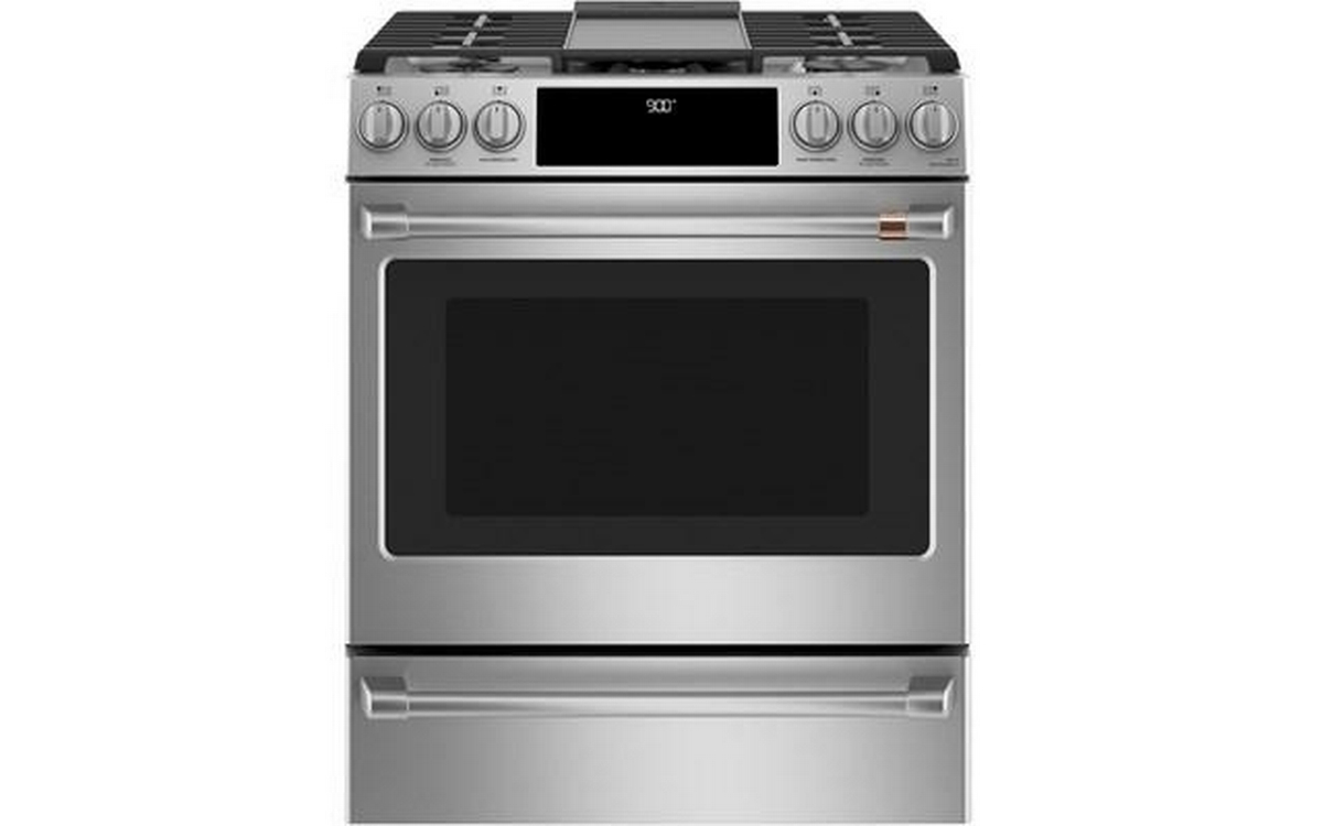 This 30-inch Café™ dual fuel slide-in range unites the power of a gas cooktop with the precision of an electric oven. The edge-to-edge cooktop with six versatile burners also includes an integrated griddle to easily handle large meals and family favorites. And true European convection creates even baking and roasting results every time.
