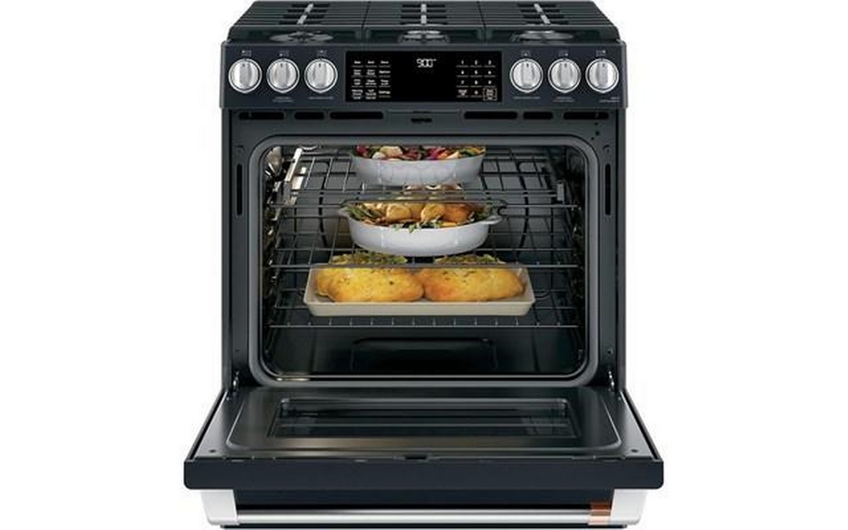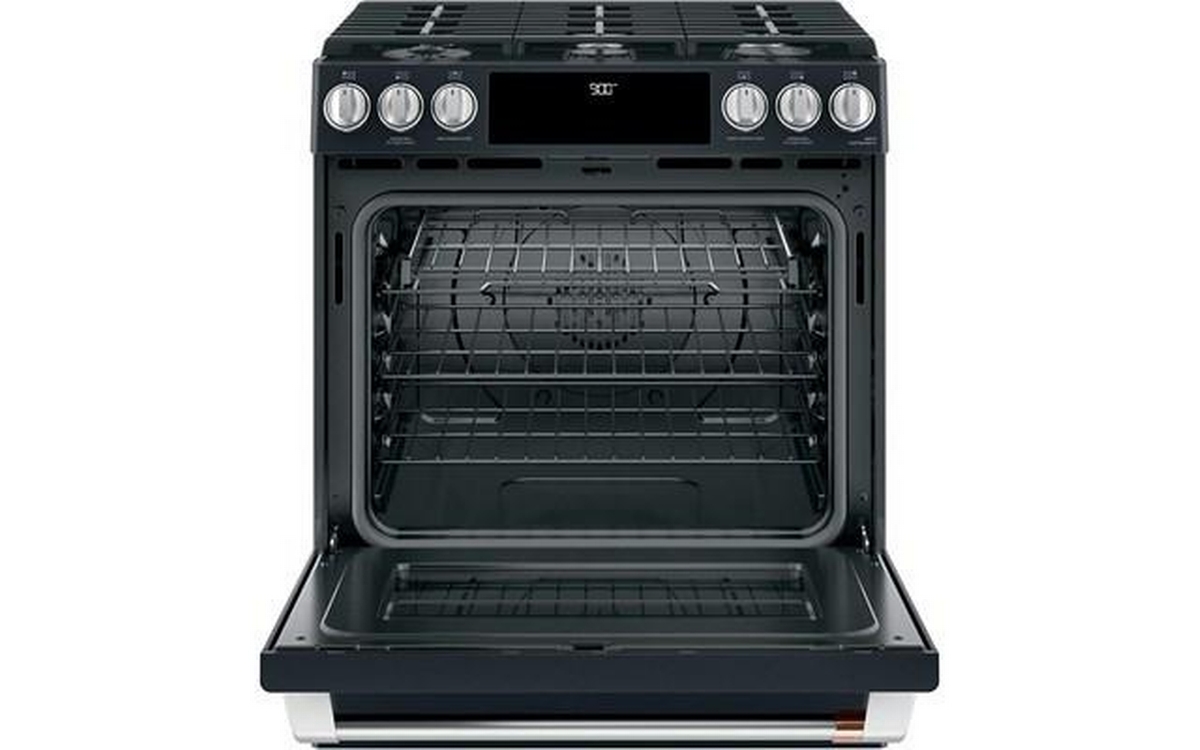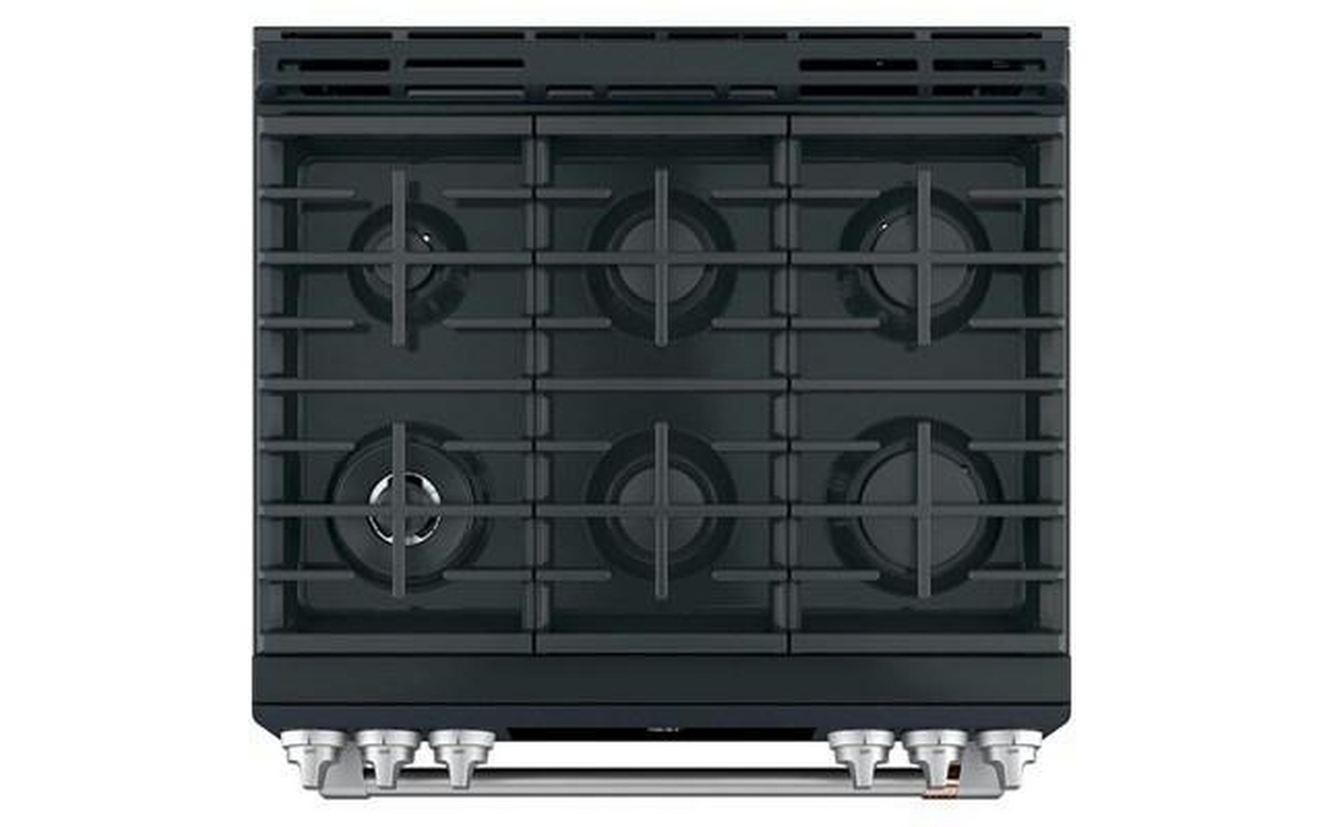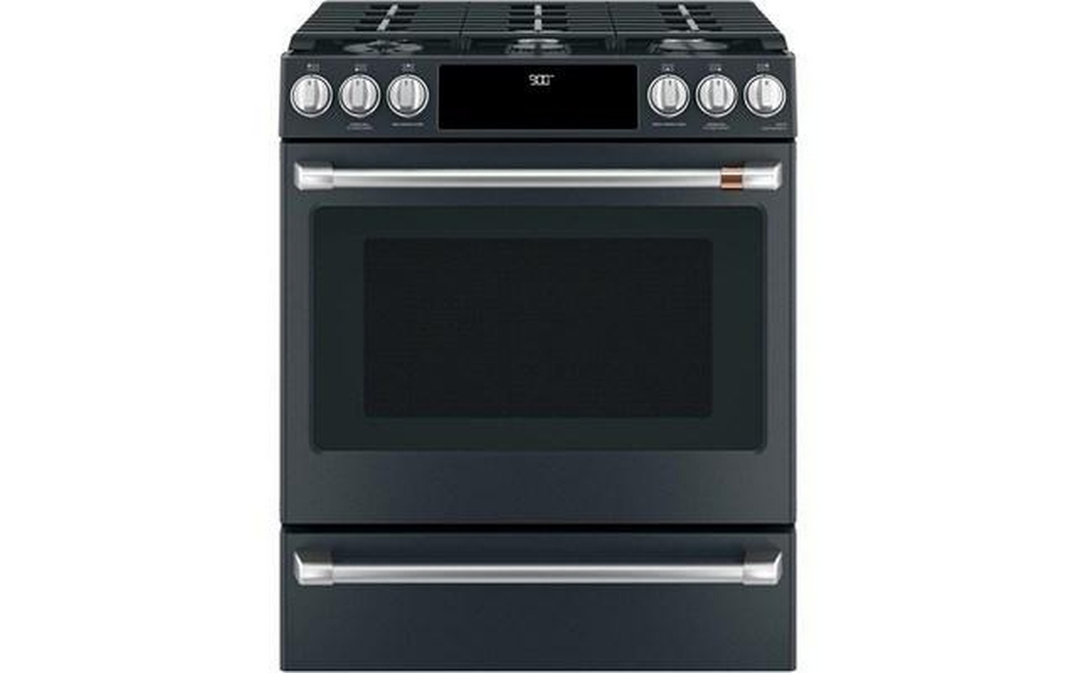 Café™ 30" slide-in front control dual-fuel convection range with warming drawer. It features Chef Connect, WiFi Connect, true European convection and self clean with steam clean option.