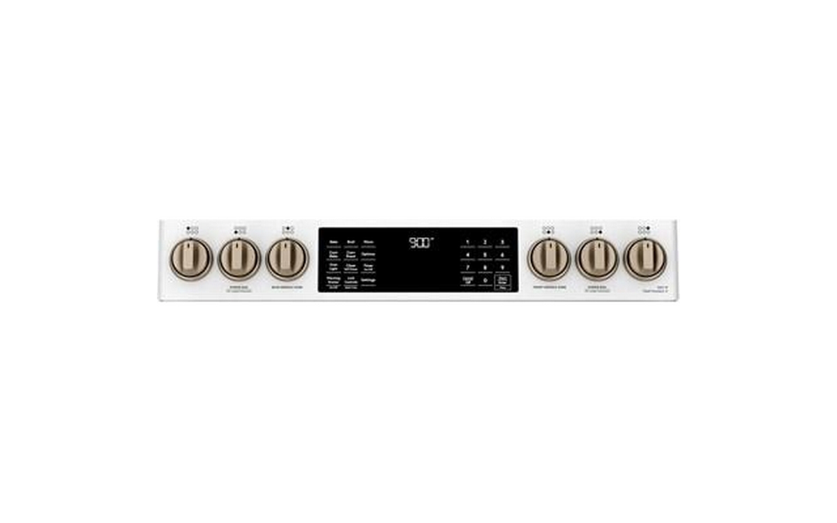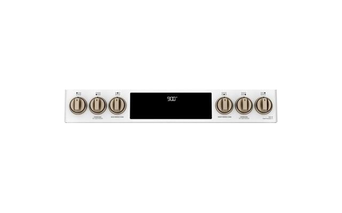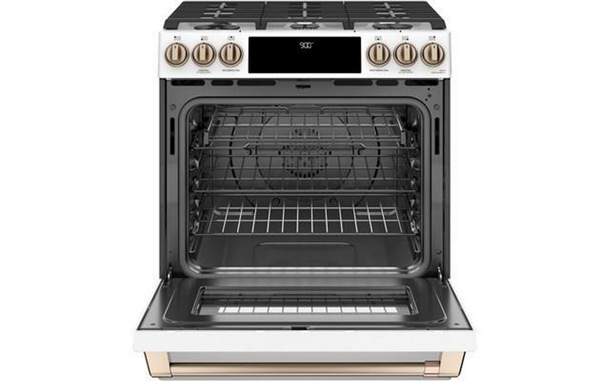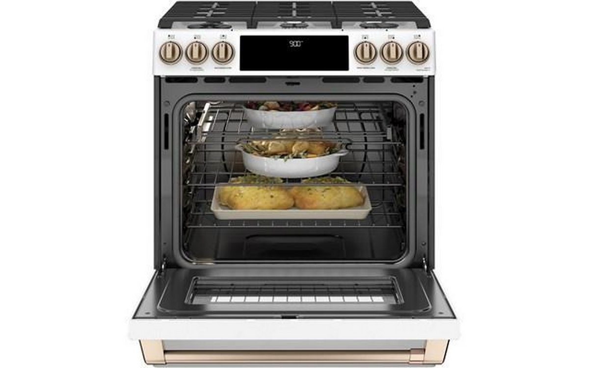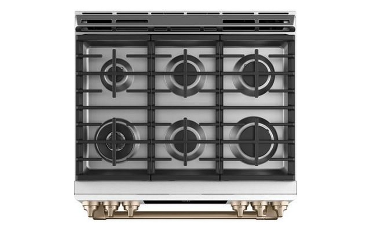 This 30-inch Café dual-fuel range features True European Convection, 5 sealed burners, warming drawer and a 5.7 cu.ft. oven capacity.