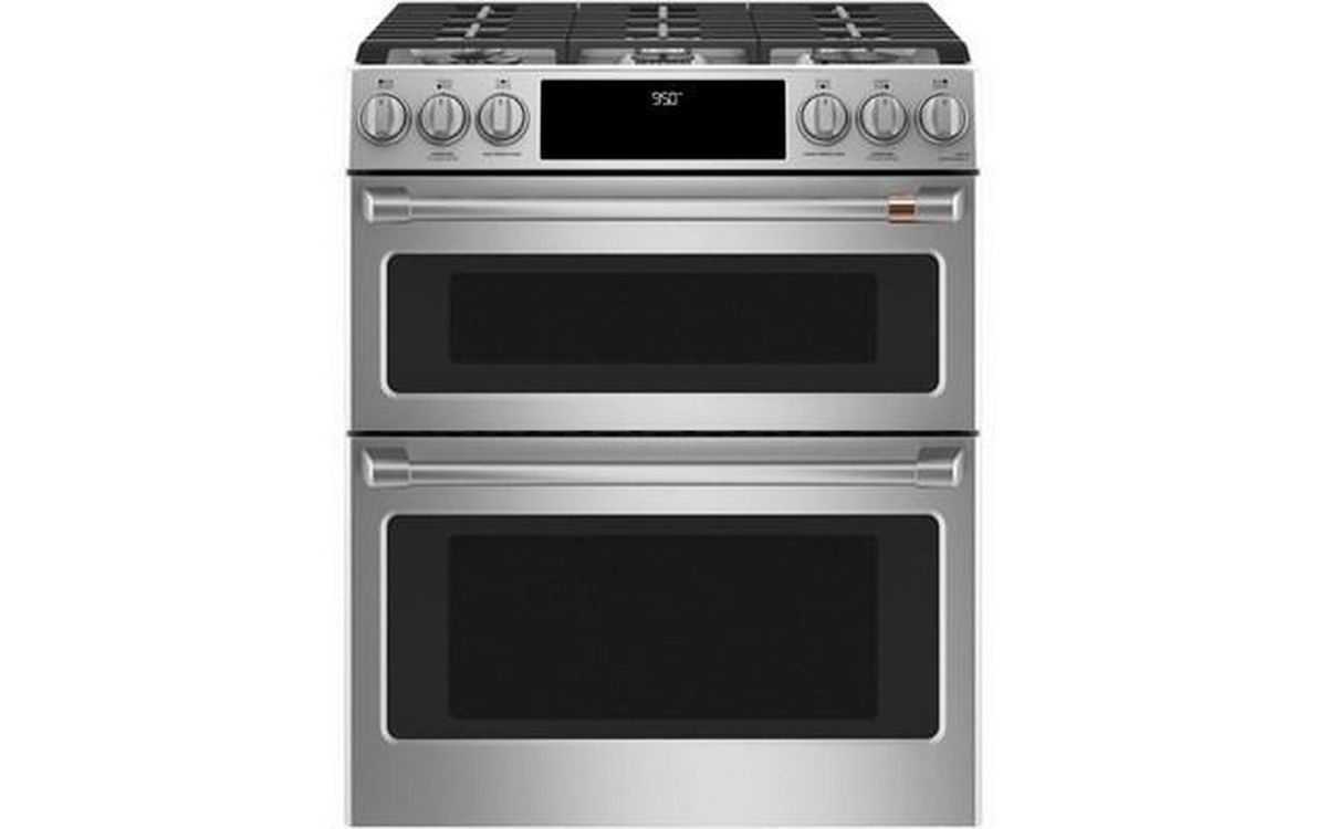 This Café 30" slide-in dual fuel double oven range features PreciseAir™ convection with a 2500 watts element, wifi connected and a self-clean oven with steam clean option.