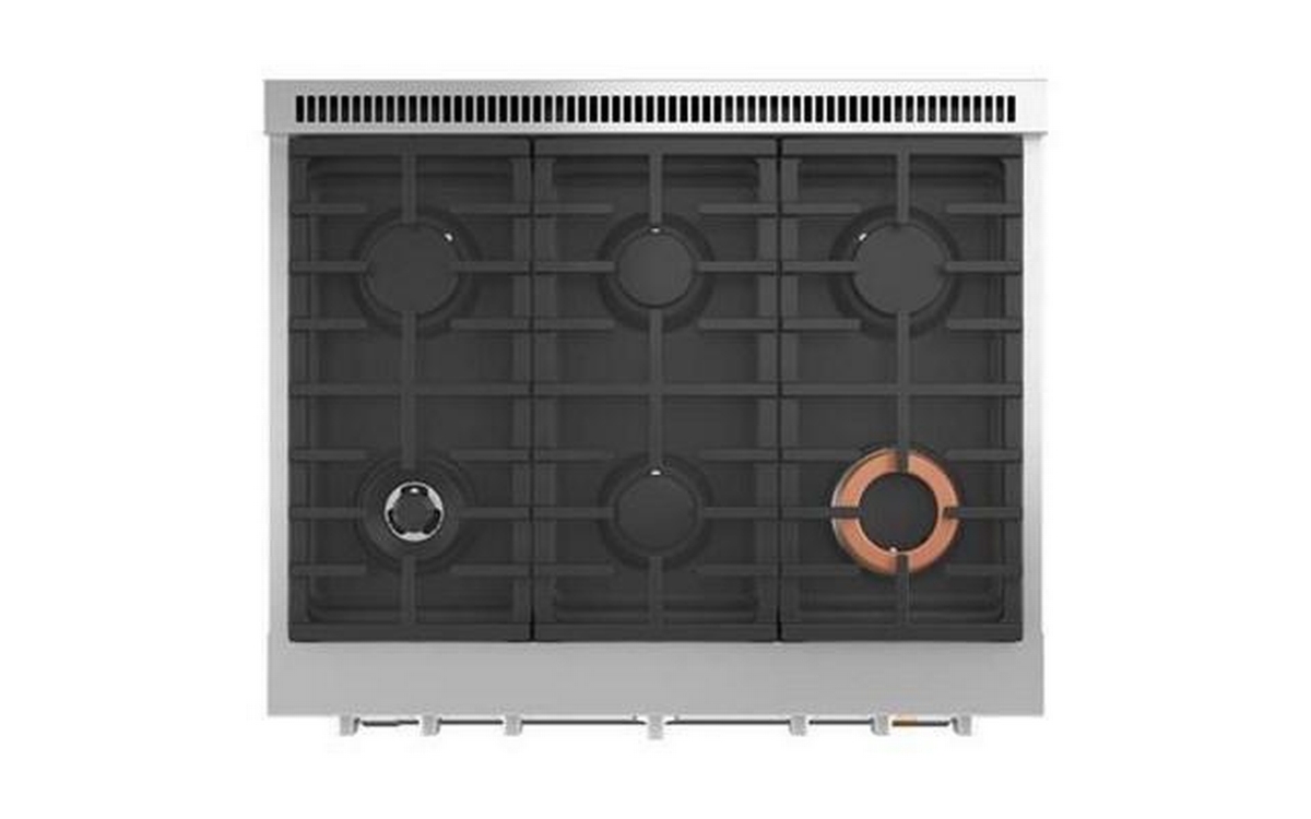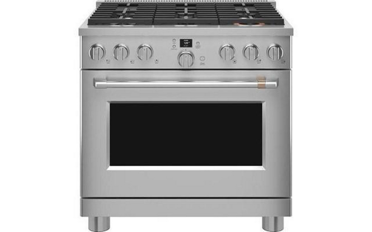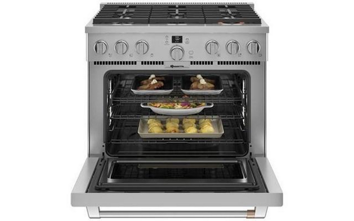 Café™ 36" smart dual-fuel commercial-style range with 6 burners (natural gas). This range offers a large capacity oven that fits a full-size catering pan, three racks, large 8-pass bake and broil elements for even heat coverage and Precision Oven modes to help guarantee results for meals of any size. The versatile cooktop on this commercial-style range features an entire arsenal of burners that give you the right amount of heat and control to perfectly cook anything from delicate sauces to expertly seared meats.