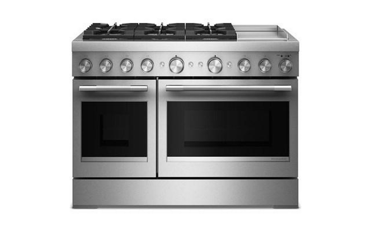 Satisfy your craving to create with a 48-inch KitchenAid® Commercial-Style Range with Chrome Electric Griddle. This dual fuel range combines an electric double oven with a 6-burner gas cooktop. Two 20,000 BTU Ultra Power™ Dual-Flame Burners offer power and precision to successfully sear, simmer, stir-fry and sauté. Even-Heat™ True Convection gives consistent baking and roasting, plus air fry mode that yields crispy, golden results.