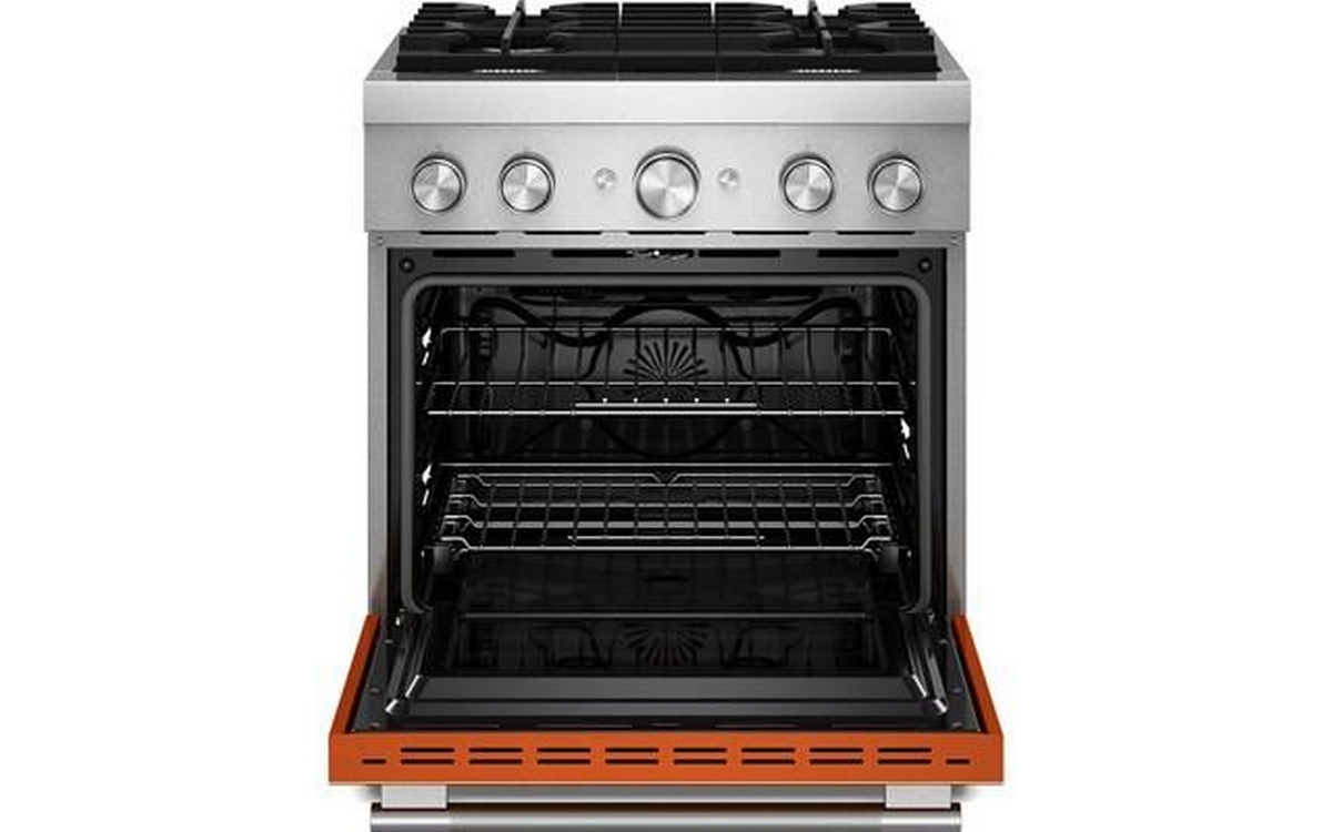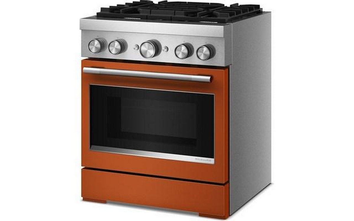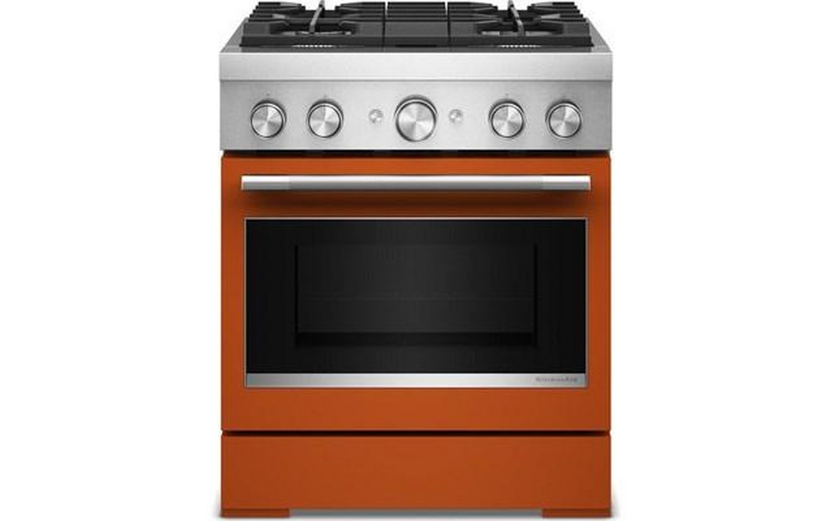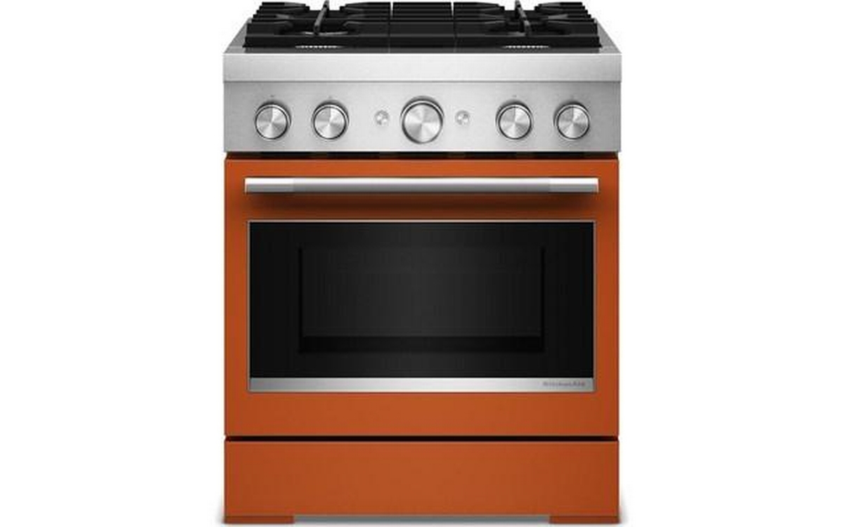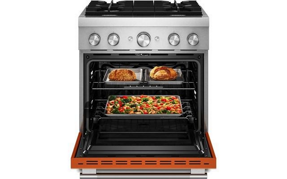 Empower your creativity with a 30-inch KitchenAid® Commercial Style Range with 4 burners. This dual fuel range combines a gas cooktop with the even baking of an electric oven. Two versatile 20,000 BTU Ultra Power™ Dual-Flame Burners offer the power and precision to sear, simmer, stir-fry and sauté. Even-Heat™ True Convection gives consistent baking and roasting, plus air fry mode that yields crispy, golden results.