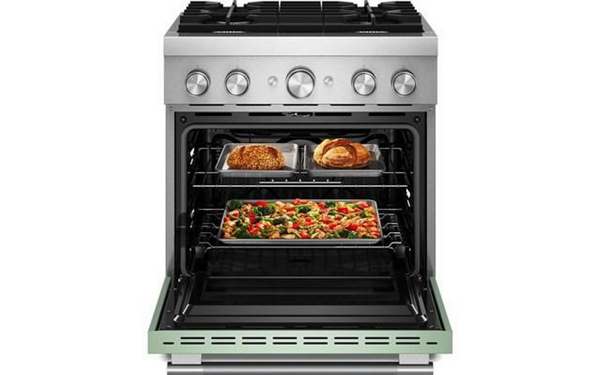 Empower your creativity with a 30-inch KitchenAid® Commercial Style Range with 4 burners. This dual fuel range combines a gas cooktop with the even baking of an electric oven. Two versatile 20,000 BTU Ultra Power™ Dual-Flame Burners offer the power and precision to sear, simmer, stir-fry and sauté. Even-Heat™ True Convection gives consistent baking and roasting, plus air fry mode that yields crispy, golden results.