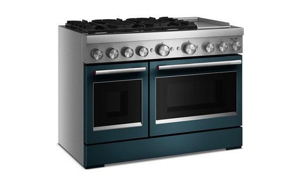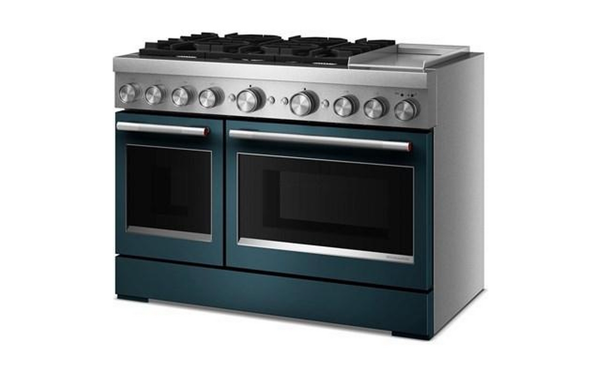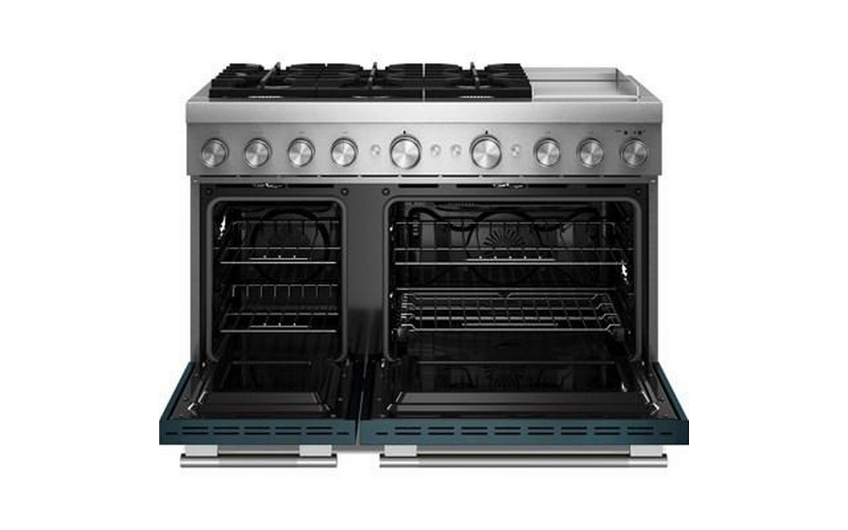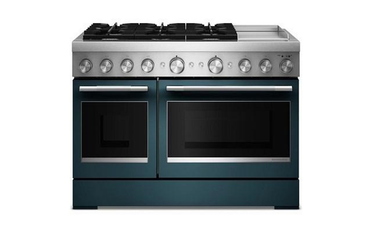 Satisfy your craving to create with a 48-inch KitchenAid® Commercial-Style Range with Chrome Electric Griddle. This dual fuel range combines an electric double oven with a 6-burner gas cooktop. Two 20,000 BTU Ultra Power™ Dual-Flame Burners offer power and precision to successfully sear, simmer, stir-fry and sauté. Even-Heat™ True Convection gives consistent baking and roasting, plus air fry mode that yields crispy, golden results.
