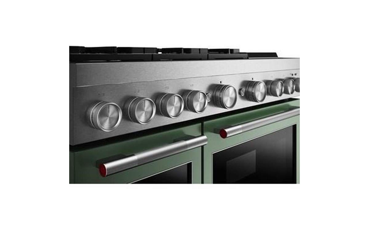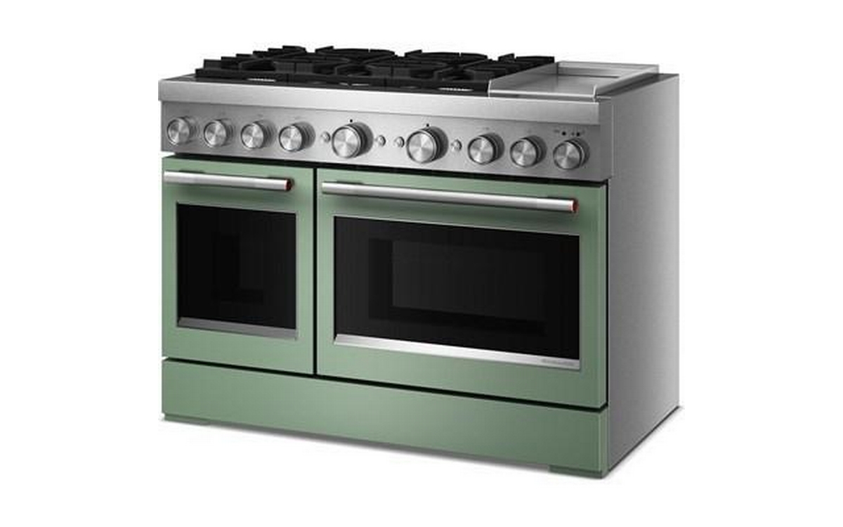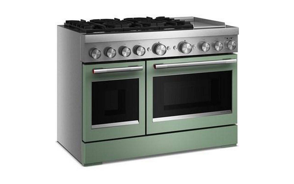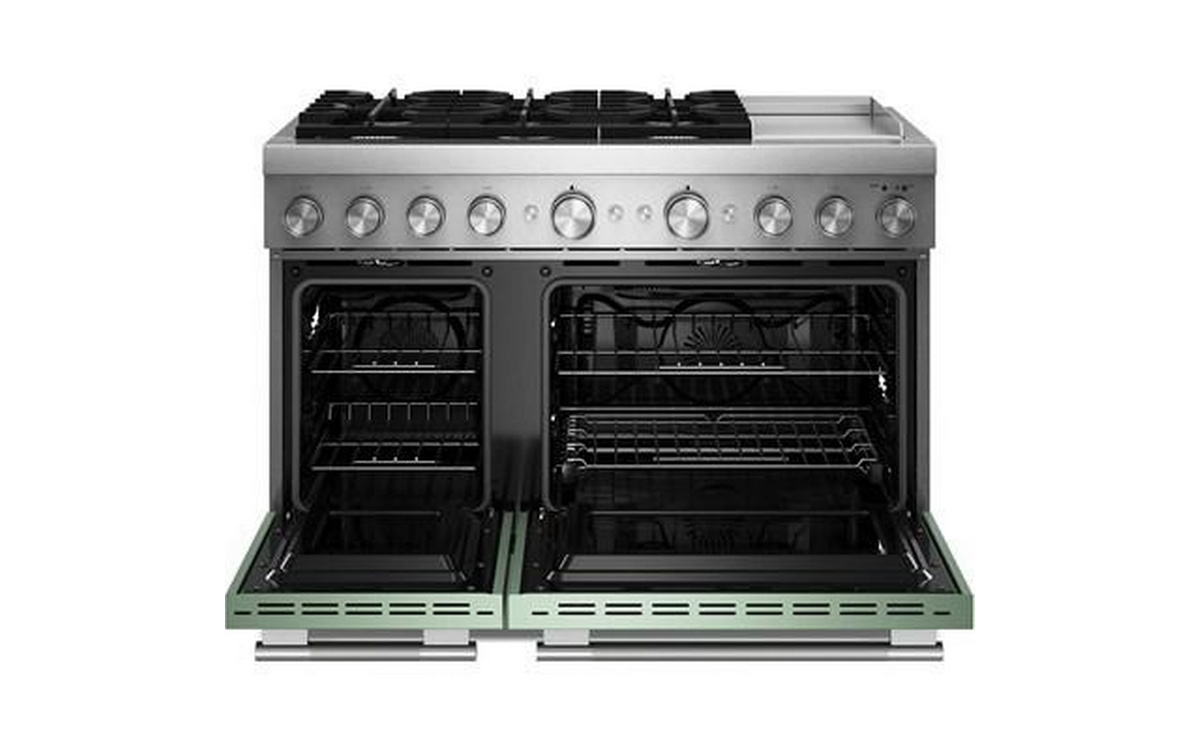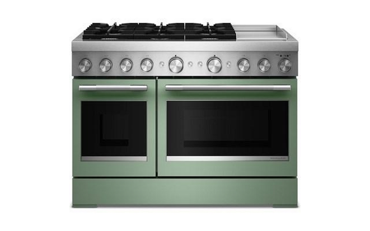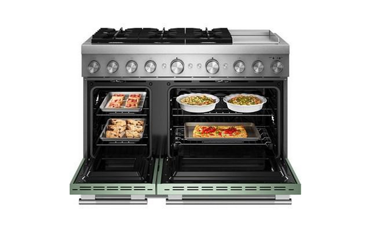 Satisfy your craving to create with a 48-inch KitchenAid® Commercial-Style Range with Chrome Electric Griddle. This dual fuel range combines an electric double oven with a 6-burner gas cooktop. Two 20,000 BTU Ultra Power™ Dual-Flame Burners offer power and precision to successfully sear, simmer, stir-fry and sauté. Even-Heat™ True Convection gives consistent baking and roasting, plus air fry mode that yields crispy, golden results.