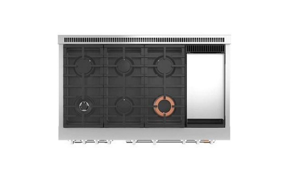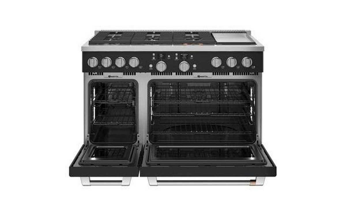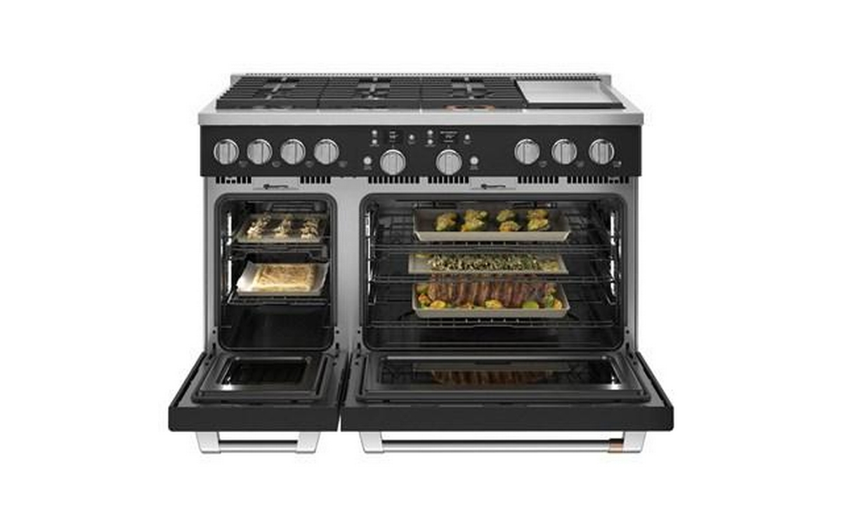 Café™ 48" Smart Dual-Fuel Commercial-Style Range with 6 Burners and Griddle (Natural Gas). Expand your culinary horizons with the commercial-style range from Café. It has a cooktop with four different types of burners for total versatility, plus two separate ovens that let you cook multiple dishes at once. The Caterer’s Oven has the capacity to fit a full-size catering pan, and the features to guarantee better results. The Everyday Oven is big enough for three 9” x 13” casserole dishes and includes two enamel racks.
