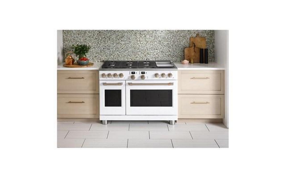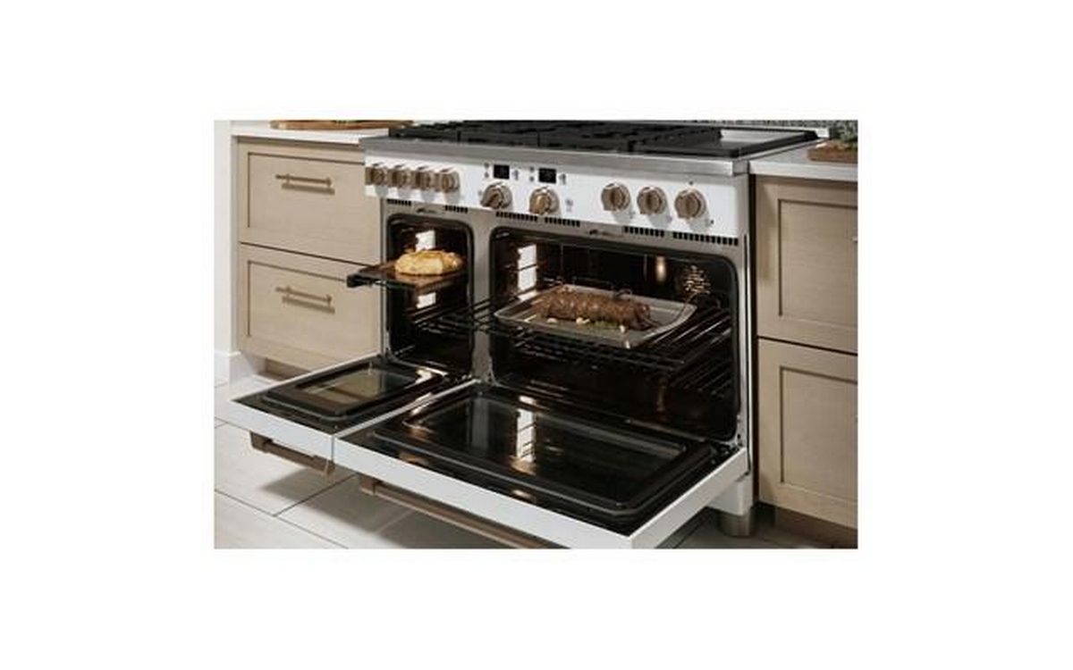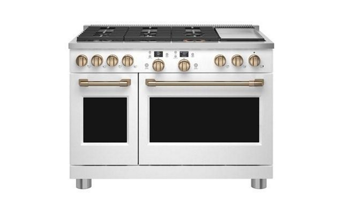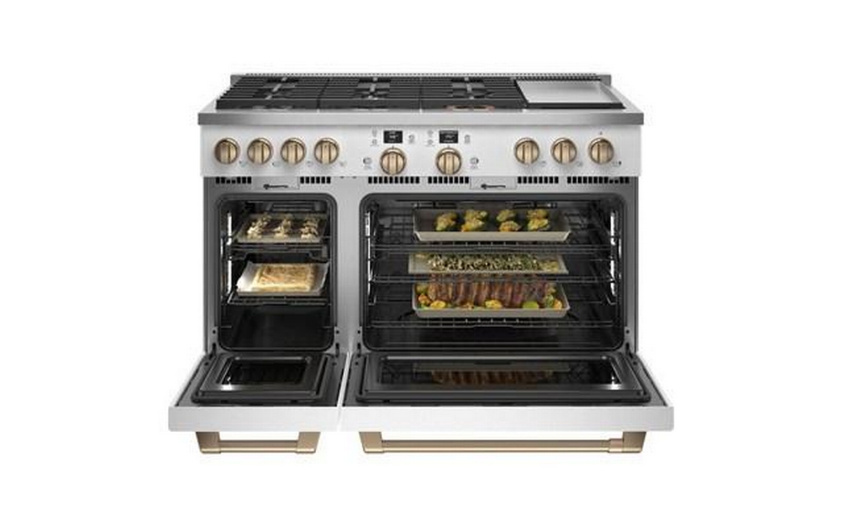 Café™ 48" Smart Dual-Fuel Commercial-Style Range with 6 Burners and Griddle (Natural Gas). Expand your culinary horizons with the commercial-style range from Café. It has a cooktop with four different types of burners for total versatility, plus two separate ovens that let you cook multiple dishes at once. The Caterer’s Oven has the capacity to fit a full-size catering pan, and the features to guarantee better results. The Everyday Oven is big enough for three 9” x 13” casserole dishes and includes two enamel racks.