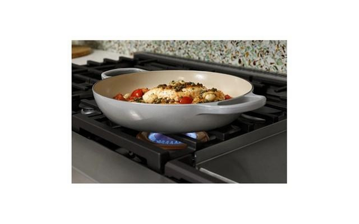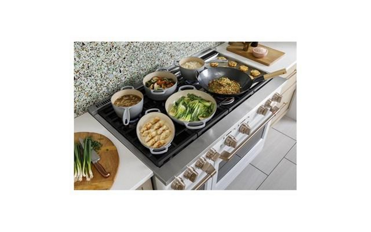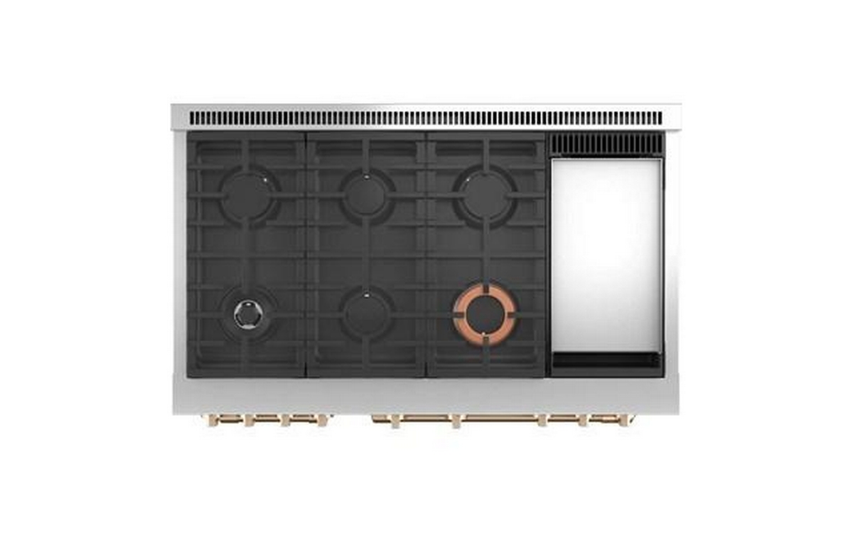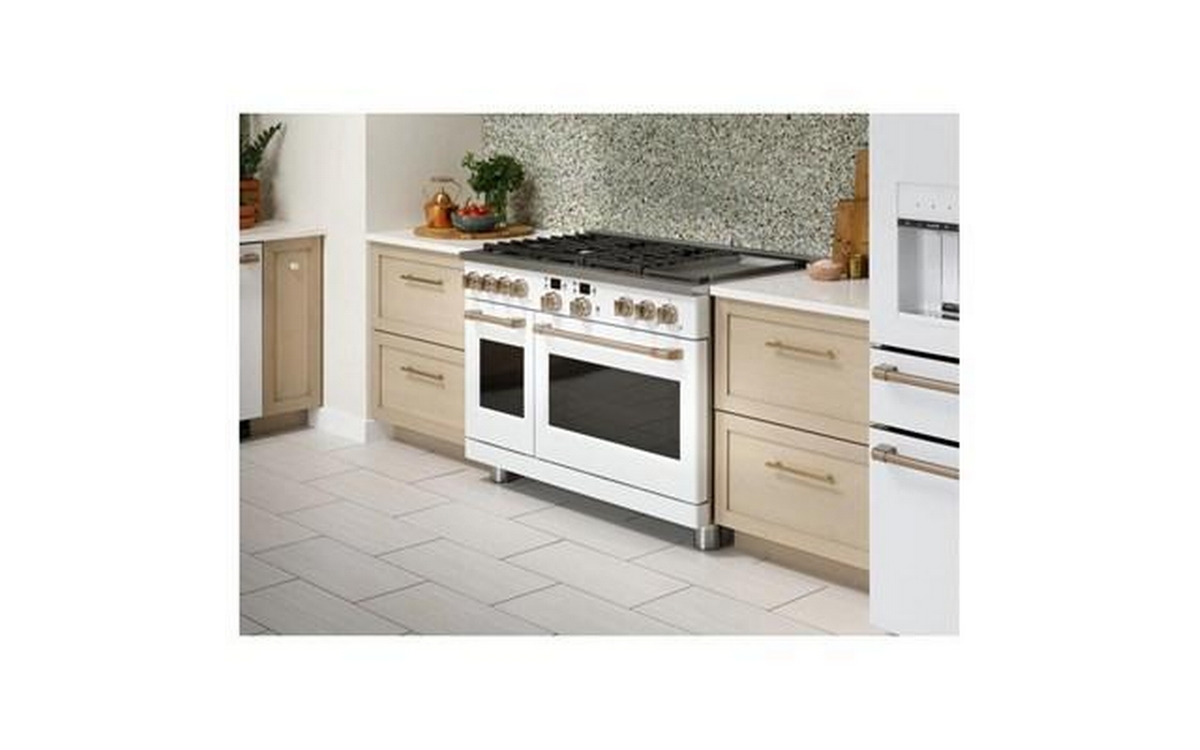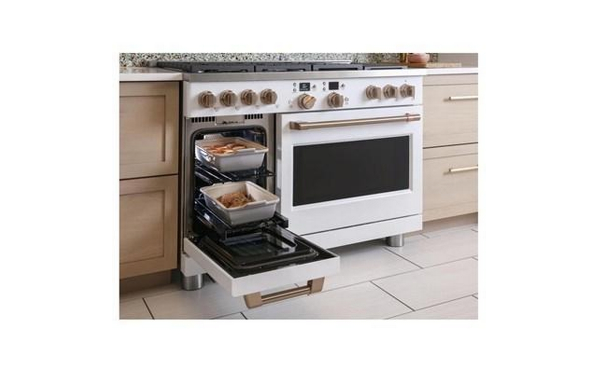 Café™ 48" Smart Dual-Fuel Commercial-Style Range with 6 Burners and Griddle (Natural Gas). Expand your culinary horizons with the commercial-style range from Café. It has a cooktop with four different types of burners for total versatility, plus two separate ovens that let you cook multiple dishes at once. The Caterer’s Oven has the capacity to fit a full-size catering pan, and the features to guarantee better results. The Everyday Oven is big enough for three 9” x 13” casserole dishes and includes two enamel racks.