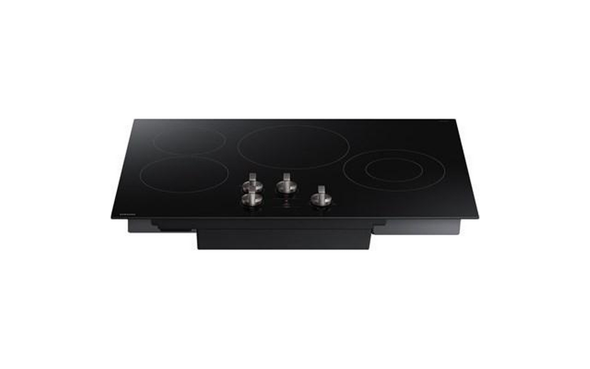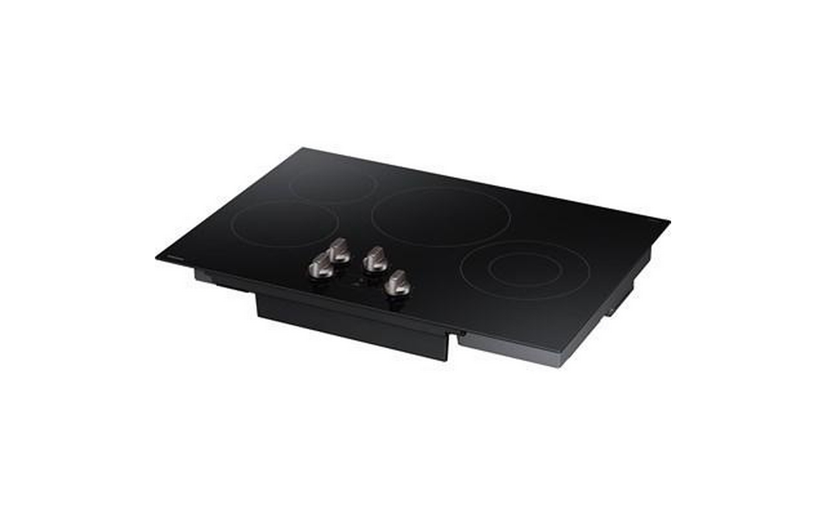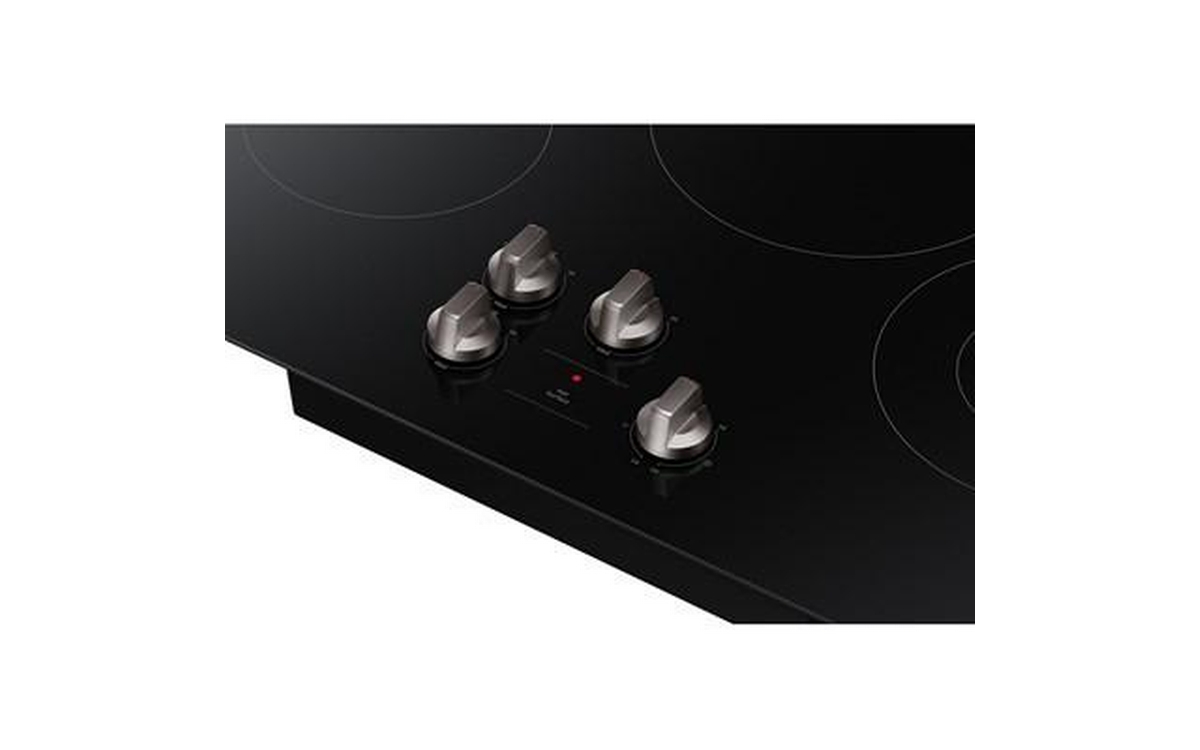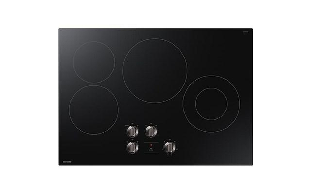 Samsung 30 Inch 4-Element Energy Star Electric Cooktop with Knob Controls. Smooth glass ceramic surface and dishwasher safe knobs make cleaning easy. Hot Surface Indicator light lets you know the surface is hot.