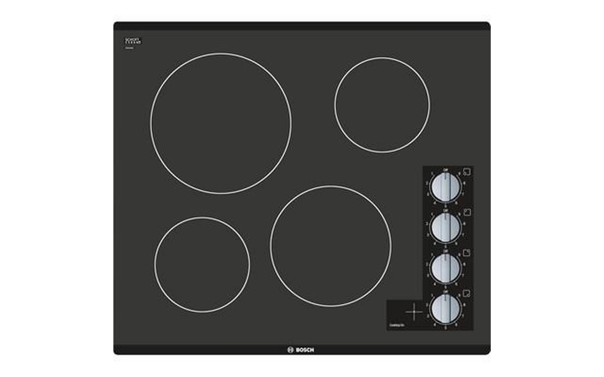 This 24-inch Bosch 500 Series electric cooktop features infinite temperature controls for precision cooking, a powerful 2,200W element for faster boil times, and a 2-level heat indicator that warns if the cooktop is warm or hot.