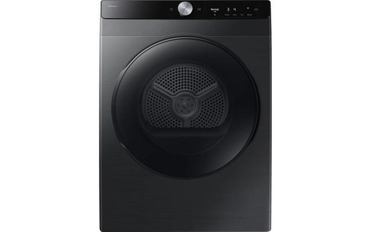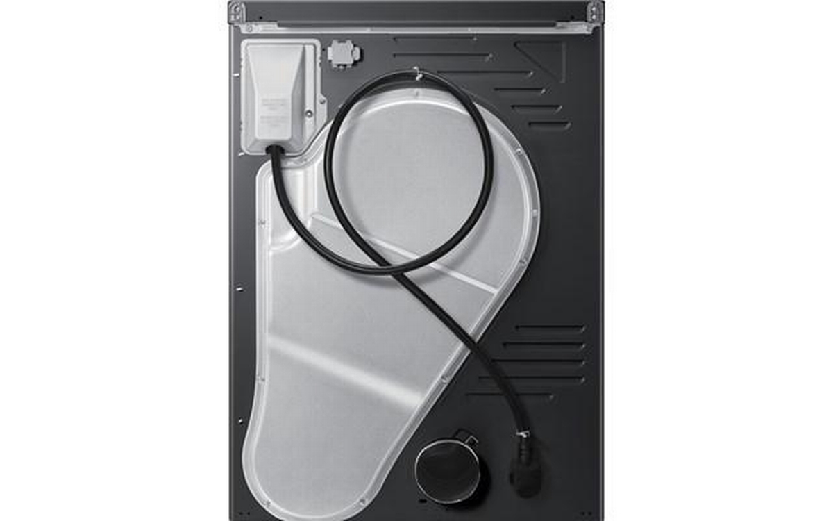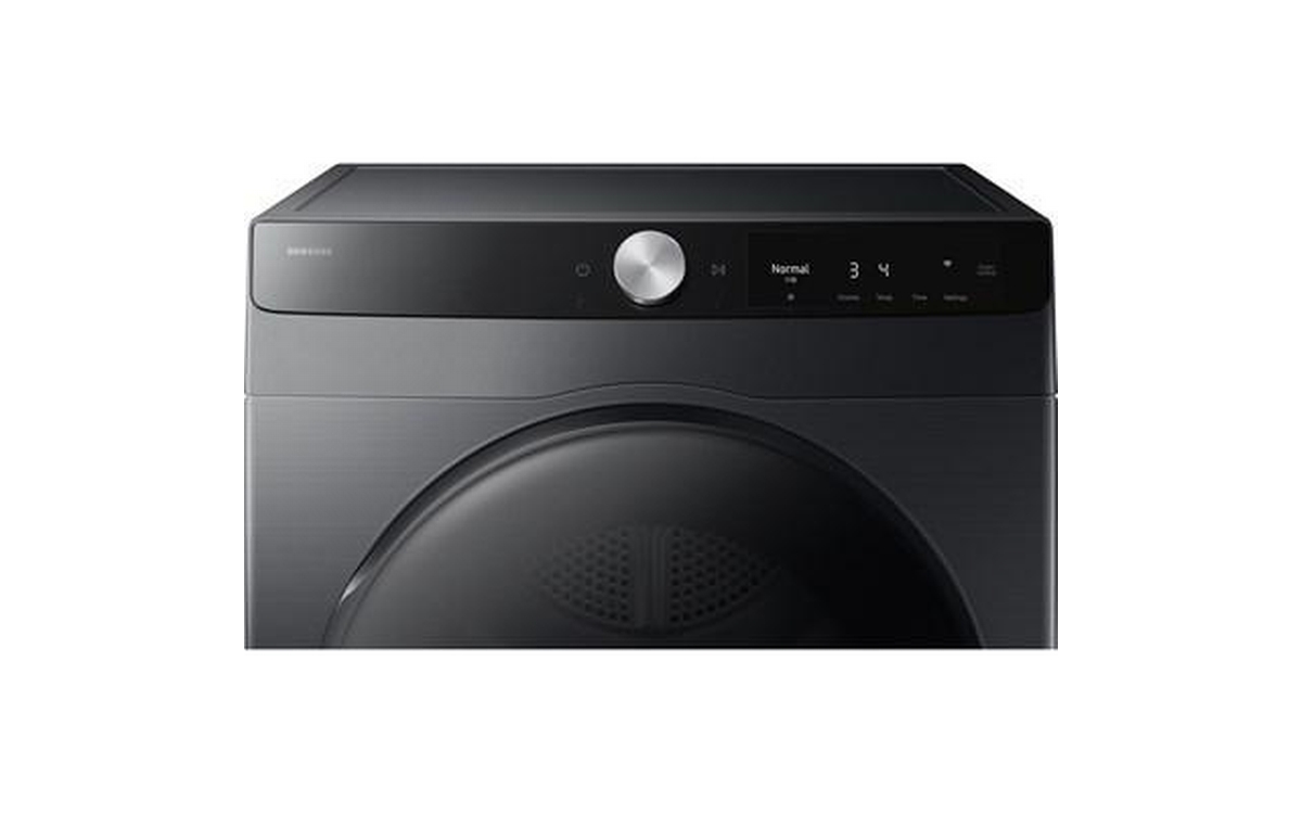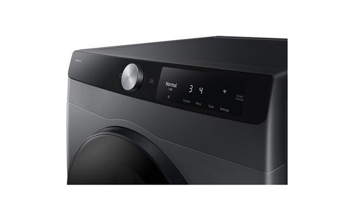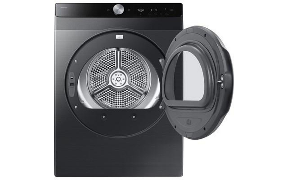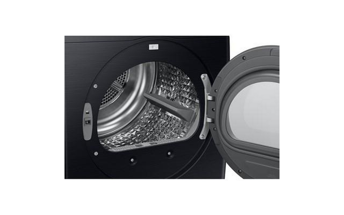 Samsung compact 4.0 cu.ft. electric dryer designed for efficiency and convenience. Featuring Smart Control, dual heater performance, reversible door, wrinkle-prevent care, damp alert, and multiple drying levels and settings. With 15 drying cycles, 13 options, interior drum light, and a stainless steel drum, this dryer delivers versatile drying results in a modern black finish.