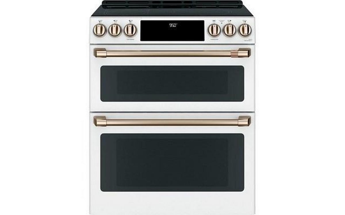 Café™ 30" slide-in front control induction and convection double oven range. It features Chef Connect, WiFi Connect, true European convection with precise air and self-clean with steam clean option.