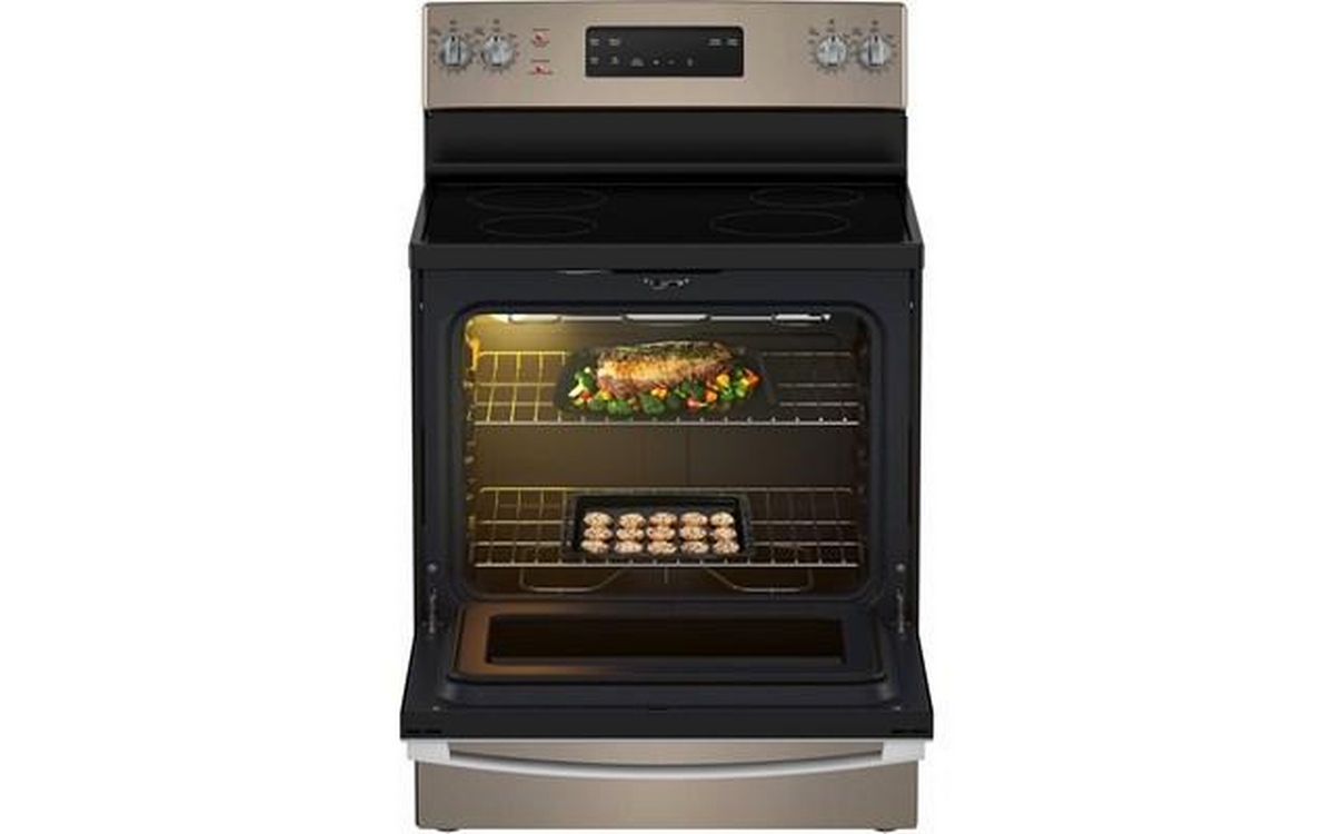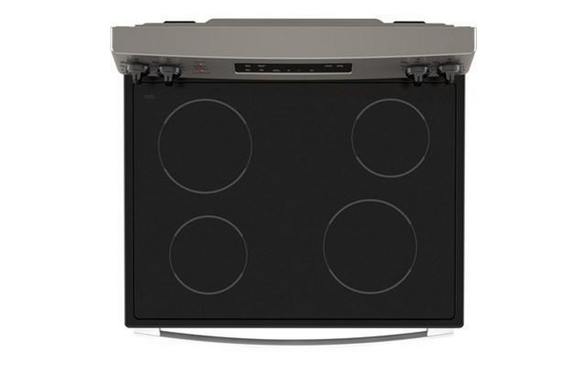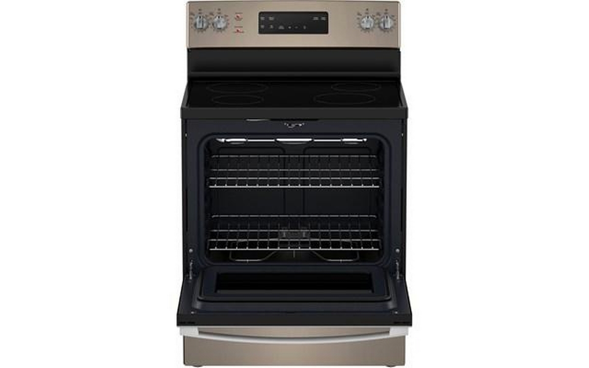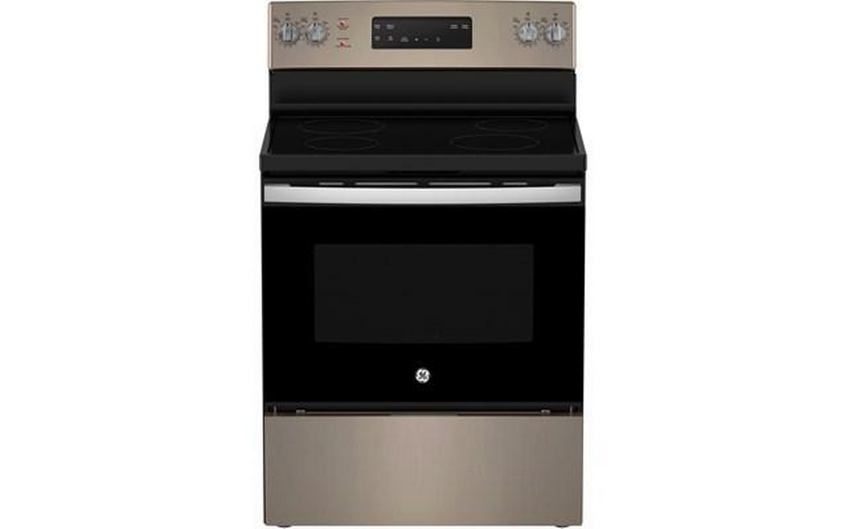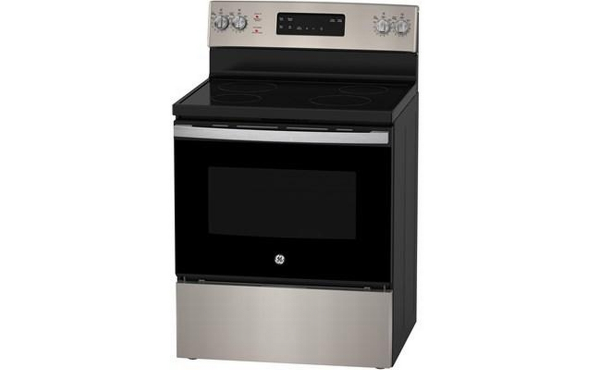 GE 30-inch freestanding electric range with 4 cooktop elements and a total oven capacity of 5.0 cu. ft.