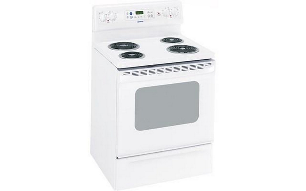 Moffat 30" freestanding electric range with 4 SensiTemp coil elements. It features a 5.0 cu.ft. oven capacity, chrome bowls, a self-cleaning oven and a Quick Clean storage drawer.