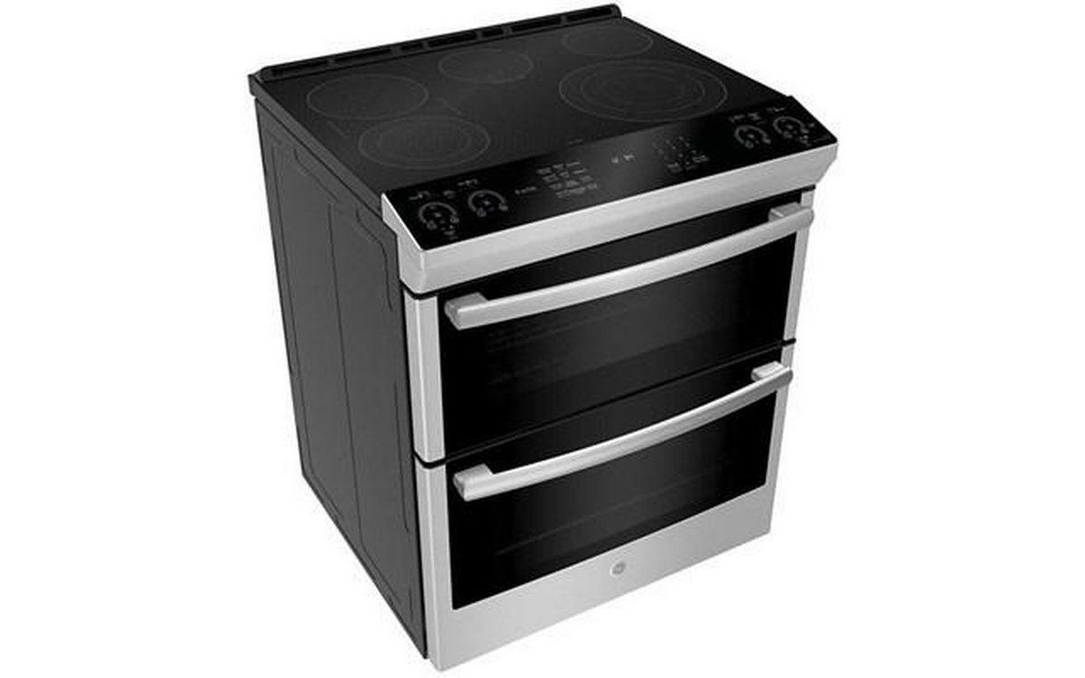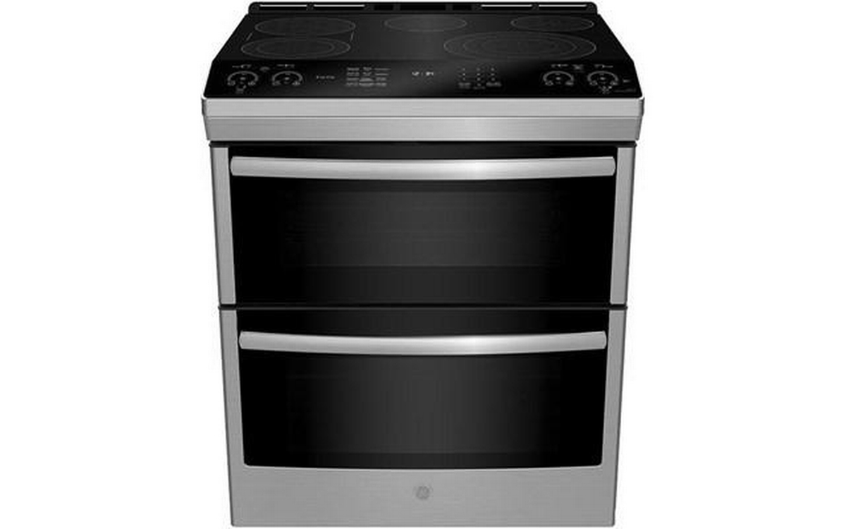 This 30-inch wide GE Profile double oven electric range features True European Convection Technology, Wi-Fi Connect, 5 cooktop elements and a total oven capacity of 6.7 cu.ft.