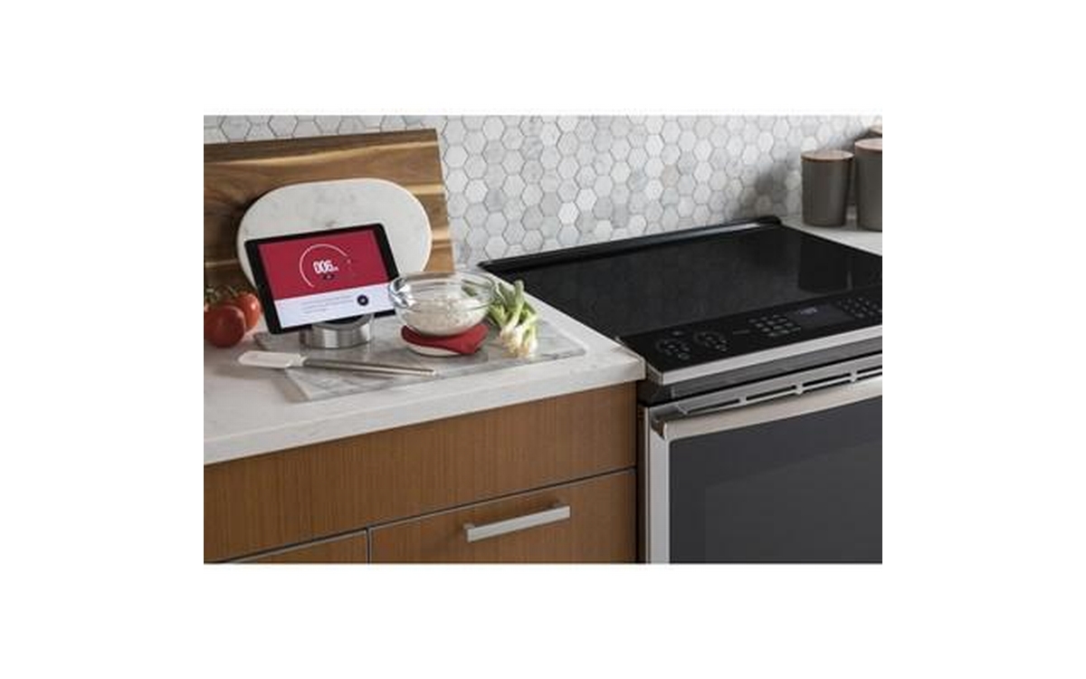 This 30-inch wide GE Profile slide-in induction range features True European Convection Technology, Wi-Fi Connect, 5 induction cooktop elements and a total oven capacity of 5.3 cu.ft.