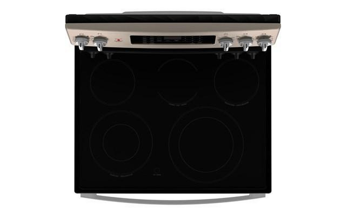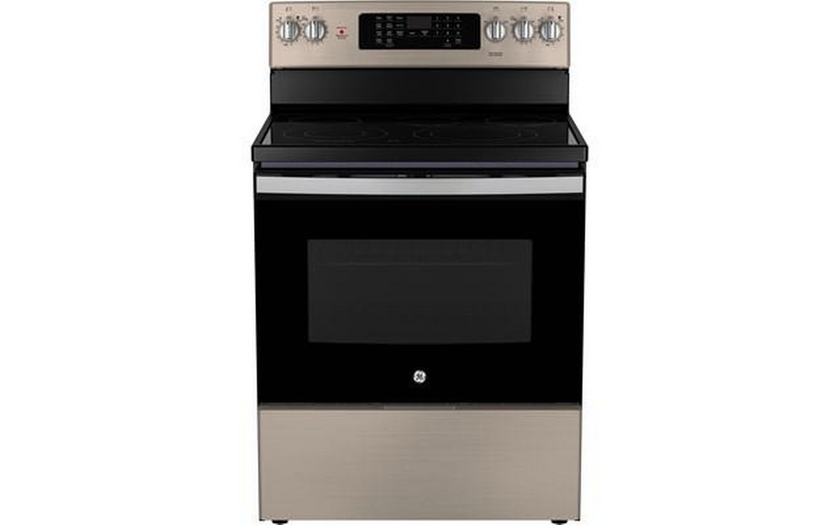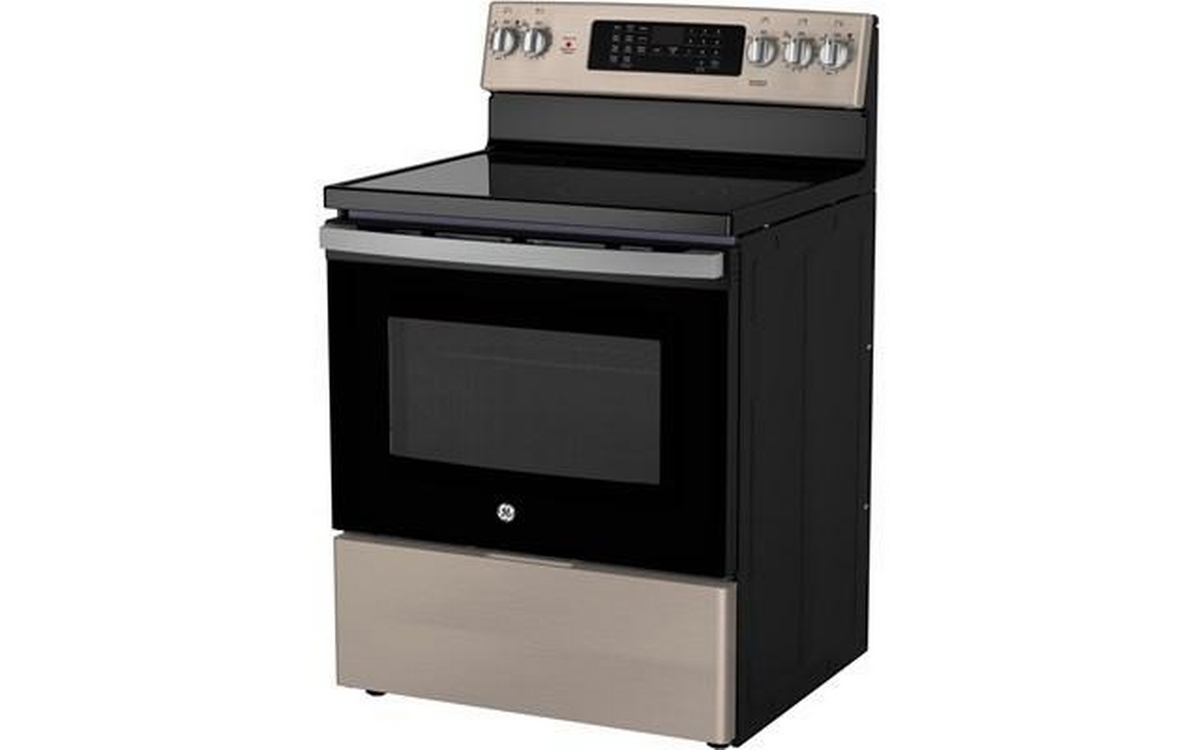 GE 30-inch electric range features True European Convection, 5 cooktop elements, Air Fry technology and a storage drawer.