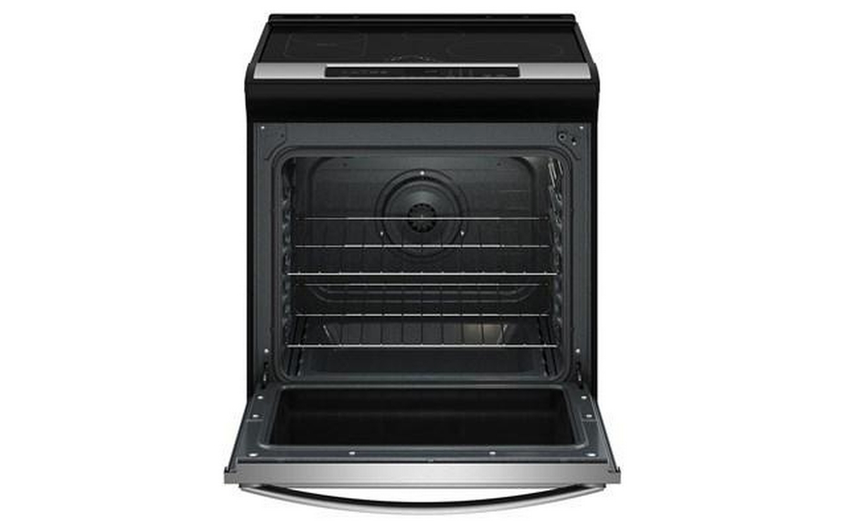 Whirlpool 30-inch induction range features 4 cooktop elements, Convection technology and digital display.