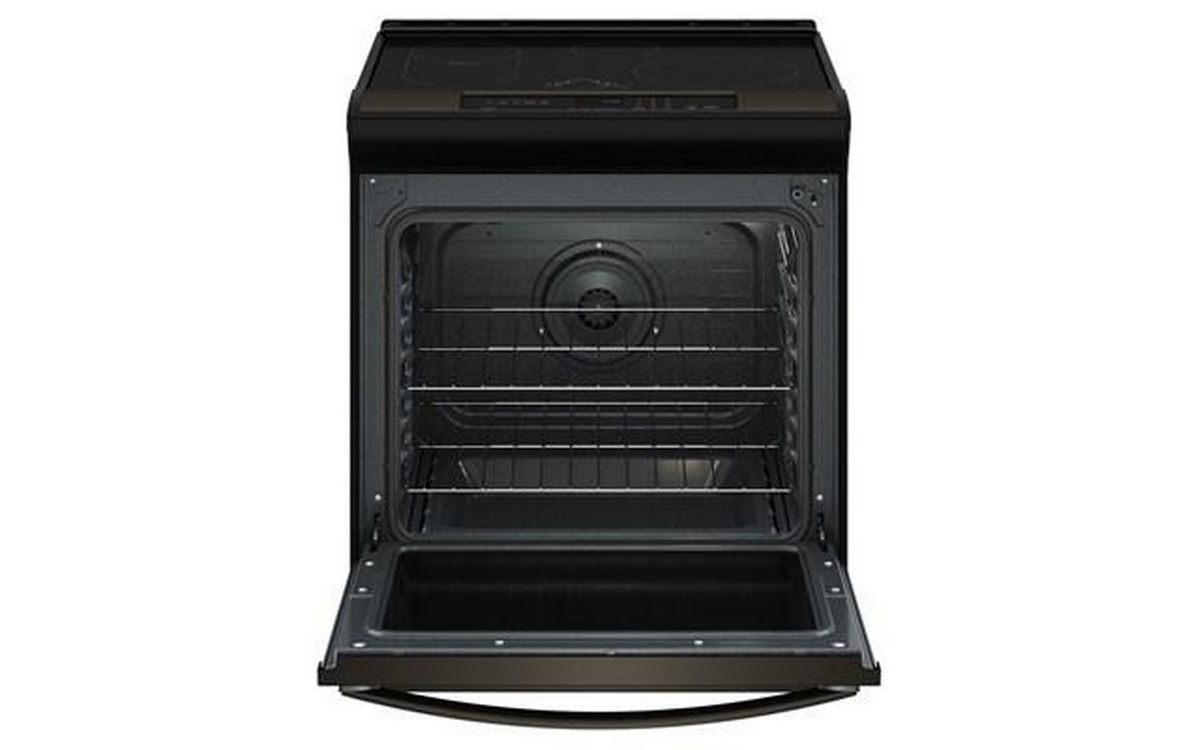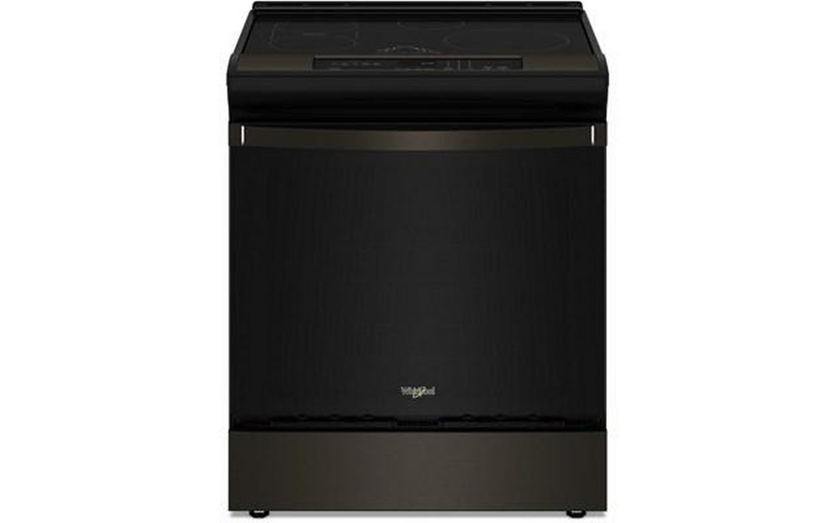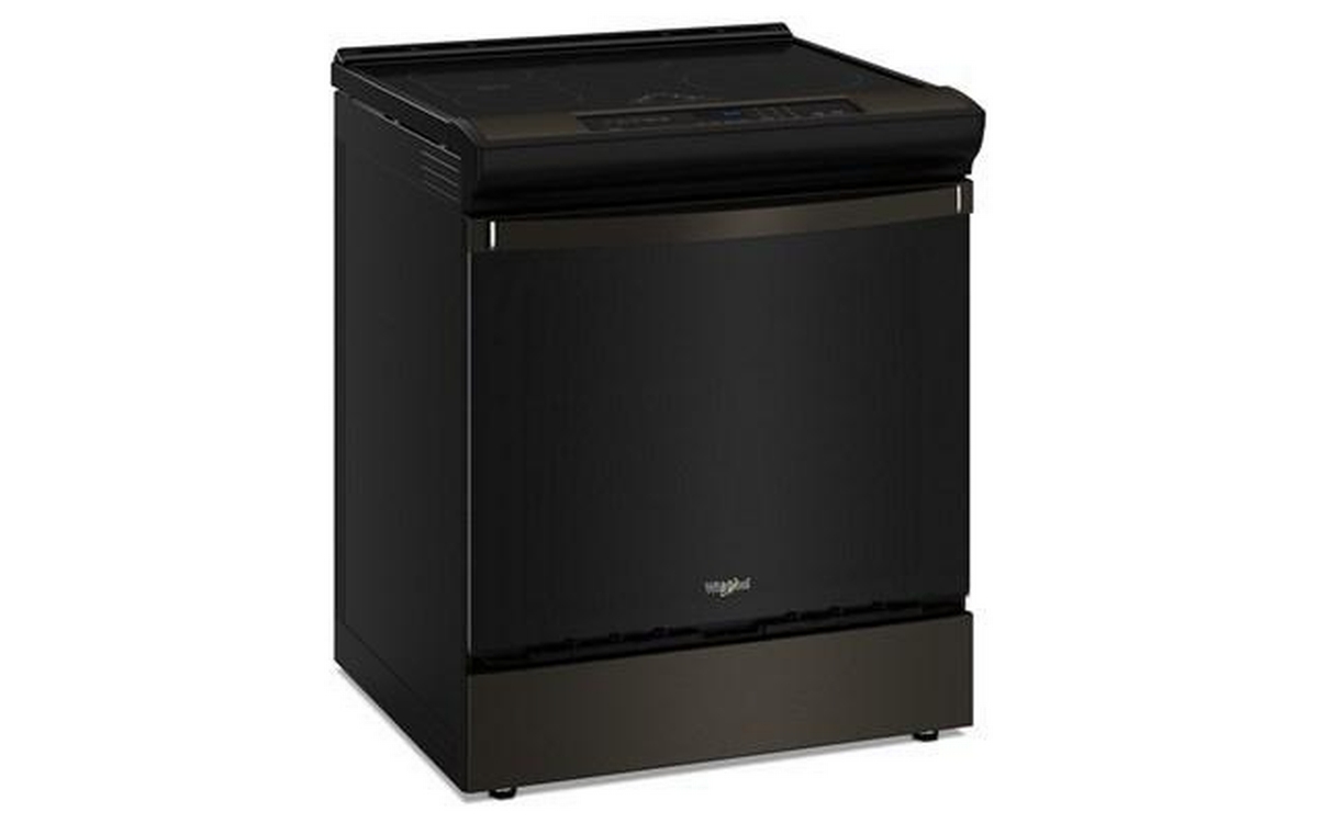 Whirlpool 30-inch induction range features 4 cooktop elements, Convection technology and digital display.