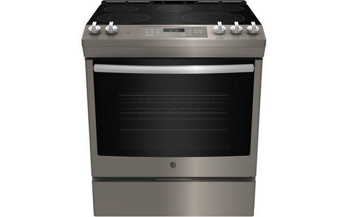 This GE 30-inch slide-in electric range features a self-cleaning oven with steam clean option, electronic touch controls and 5 elements.