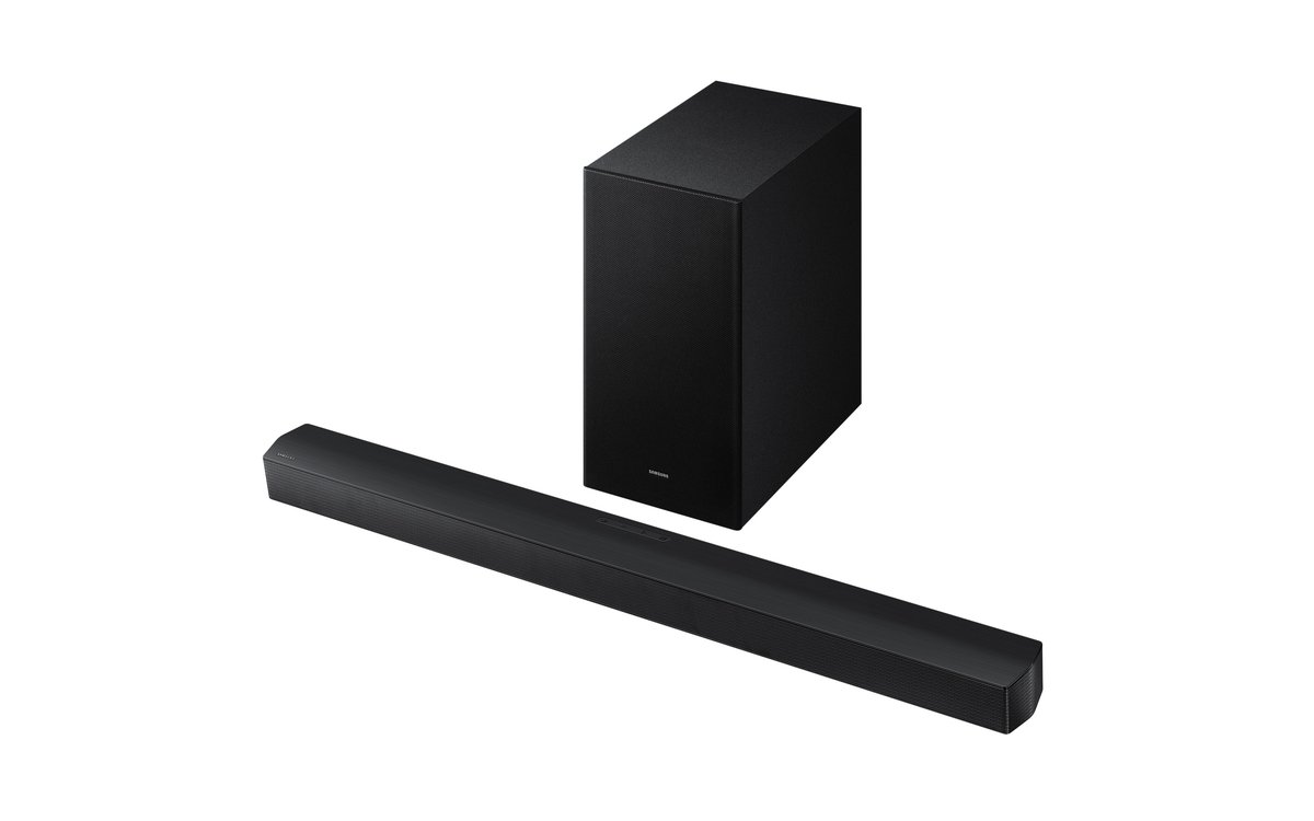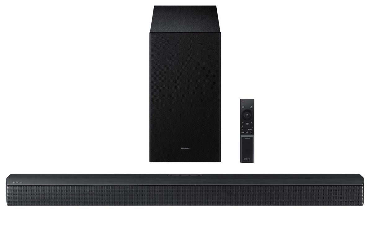 Dolby Audio / DTS Virtual:X DTS Virtual X creates spacious 3D sound, including a sense of height, using audio processing techniques. Subwoofer included Boost your sound experience with the subwoofer included with your soundbar. It accentuates the bass for deeper, more subtle notes. Discover incredible cinema-quality sound. Bass Boost When you want to push the bass for total immersion, simply activate the Bass Boost mode on your soundbar. The included subwoofer takes powerful, deep bass to the next level and envelops you in a full soundscape. Integrated center speaker Enjoy crystal-clear dialogue thanks to the dedicated center speaker. It ensures perfectly balanced sound that enhances the quality of your entertainment. • Q-Symphony • Adaptive Sound • Voice Enhancement • Game Mode • Night Mode • Compatible with wireless surround sound • HDMI ARC • Multiple Bluetooth connections • Single remote control • Decoding formats: MP3, AAC, OGG, FLAC, WAV, AIFF