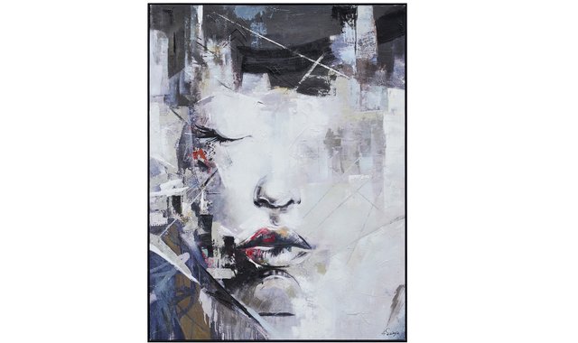 Delicate yet edgy, this cotton canvas showcases an exquisite collage of artistic portrait and urban graffiti. Whether set in the sleek black interior or a vibrant and vivacious space, it brings a creative energy to the space. The variety of brush strokes adds powerful dimension to the piece.
