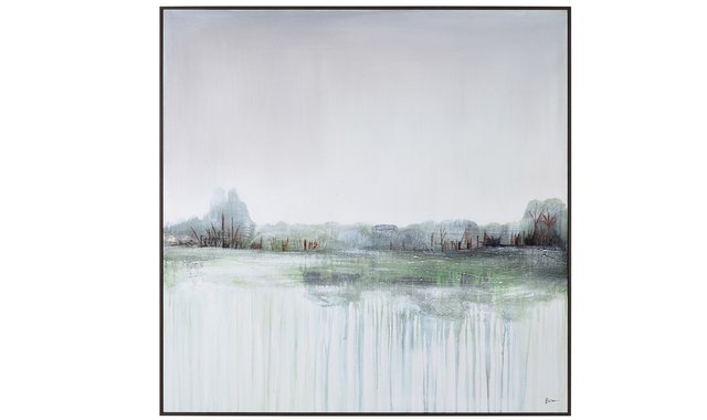 The classic interior receives a stroke of calming energy with this canvas piece. Showcasing soft muted tones of grey and green, it captures the palette of a misty morning in every corner. With lengthy strokes depicting the reflections within the water, it adds dimension to the room without the need for additional embellishment.