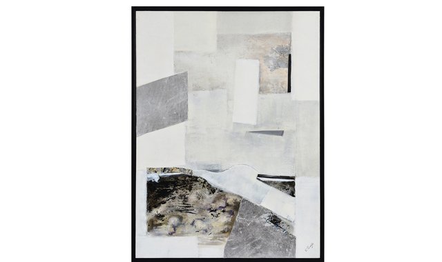 Elements of silver paper, black sand and gel form a collage of refinement in this work of art. Hanging horizontally or vertically on the wall of the neutral-toned contemporary interior, it adds complexity to the space without causing a clash. Its rectangle shape offers plenty of space for each component within its design to take the spotlight.