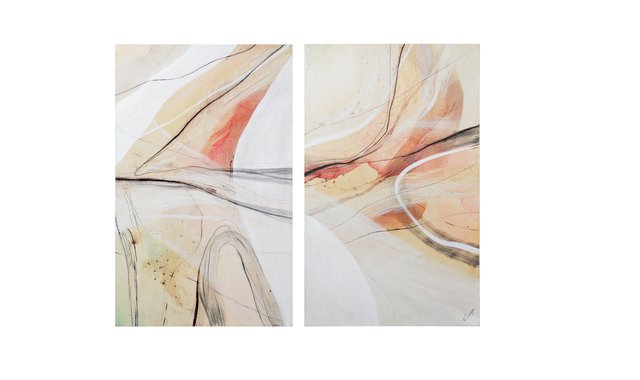 This striking artwork feels both serene and significant. This hand-painted piece of art set on cotton canvas is an idyllic fit for a bedroom or hallway space. The hand-painted watercolor strokes in shades of beige and peach further elevate the calming quality. Set Of Two Hand-Painted Canvas 2-Way Hanging