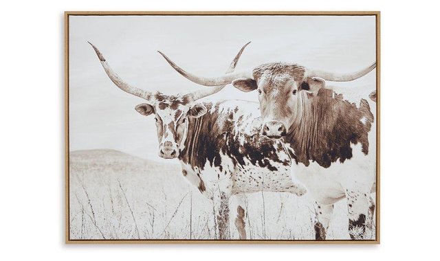 Create an idyllic feel in your interior with the Griffner wall art. A peaceful portrait of longhorn cows roaming the countryside, the sepia-toned piece has a vintage vibe well-suited to casual and farmhouse aesthetics. Its natural charm is a welcome addition to existing wall decor, and it also makes an effortlessly chic accent when hung alone. Product Features Framed gallery wrapped canvas D-ring bracket Horizontal hanging only