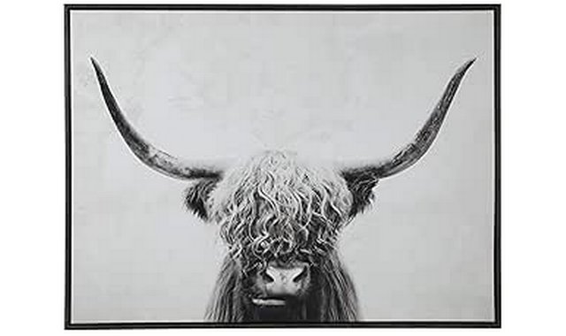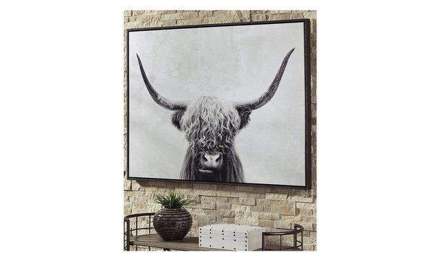 Bring home a piece of Scottish livestock with this wall art. Highland cow looks straight ahead with shaggy hair and prominent horns, creating a beautiful white negative space. Sleek black frame creates a boundary and makes a statement in your home. Product Features Framed gallery wrapped canvas Sawtooth hanger Clean with soft, dry cloth