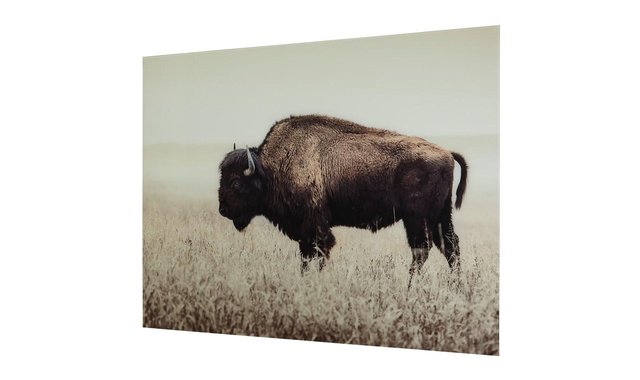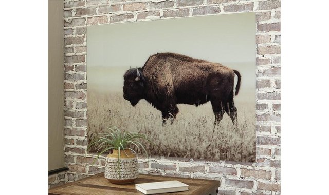 Add a touch of rustic refinement to your decor with this unique sepia wall art. Glass reproduction of a lone bison calls to mind tintype photos of the Old West, making for a retro look loaded with charm. Product Features Reproduced on glass Sepia bison Sawtooth hanger